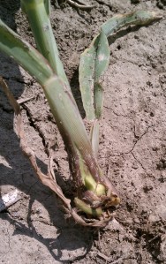 Often I see rootless corn syndrome as a problem with smaller plants-3 leaves or less-in which the seed was planted shallow to allow for planting in wet soils. Windy conditions and lack of soil moisture near the surface can allow for poor root development leading to rootless corn syndrome. Thus, I recommend planting corn 2″ deep and not planting shallow to avoid this problem later on.