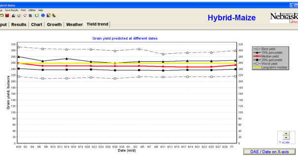 Hybrid-Maize model can be used during the current crop season to forecast end-of season yield potential under irrigated and rainfed conditions. To do so, Hybrid-Maize uses observed weather data until the date of the yield forecast and historical weather data to predict the rest of the season. This gives a range of possible end-of-season yields. This range of simulated yields narrows as corn approaches maturity.