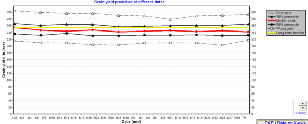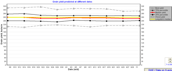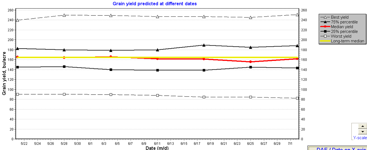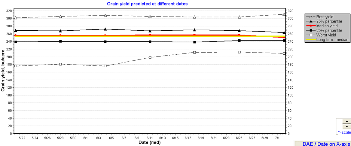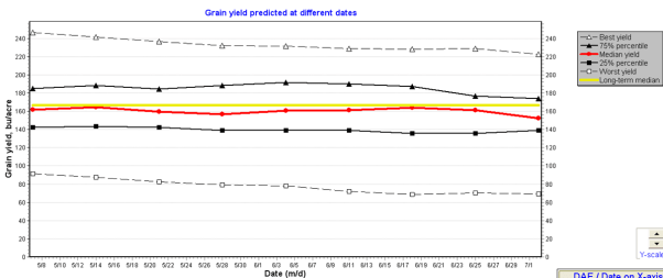 - May 15 planting date, 113 day rm: Best yield is 250 bu/ac. Predicted mean is 161 vs. long term median of 165 bu/ac.