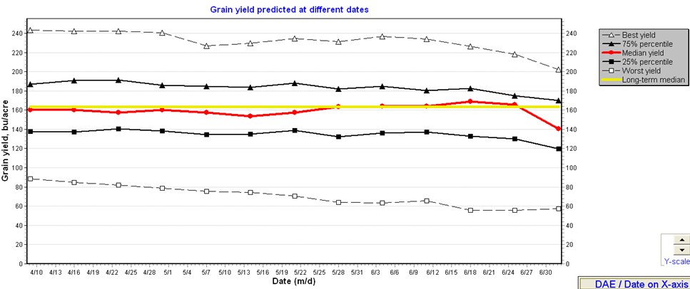 - April 15 planting date, 113 day rm: Best yield is 224 bu/ac. Predicted mean is 146 bu/ac vs. long term median of 167 bu/ac.
