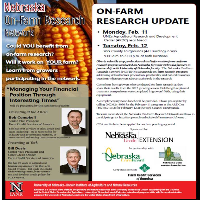 We have some upcoming opportunities for you to learn more. On February 11 and February 12 from 9:00 a.m.-3:00 p.m. at UNL’s Ag Research and Development Center near Mead and the York Co. Fairgrounds in York respectively, growers who conducted on-farm research in 2012 will be sharing their results; you can also learn more about conducting on-farm research in your own field. There is no charge for the meetings courtesy of the Farm Credit Services of America but we do need an RSVP for meal count and handouts. Please RSVP by calling (402)624-8030 for ARDC or (402)362-5508 for the program in York. I hope to see you at these meetings as well!