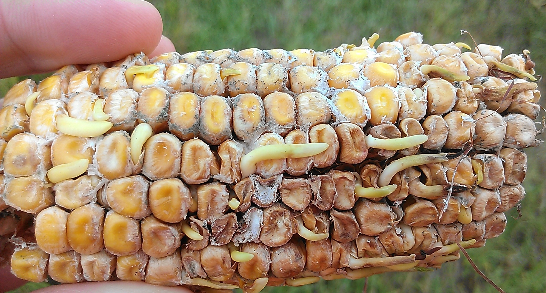 The latest event in the Clay County storm occurring August 1st has become germination of “good” kernels left on the ears that have been damaged by