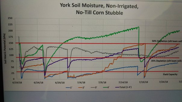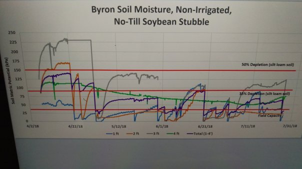 Total rains received since the last graph are ? Total soil moisture depletion (top 4 feet) is at 50%. Corn at this location was three leaves from tasseling on 7/11.