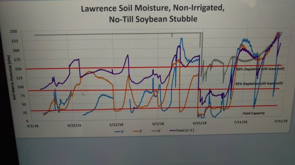 Rains received since the last time I showed graphs are ? Total soil moisture depletion (top three feet) is showing above 50% depletion. Corn at this location is pollinating.