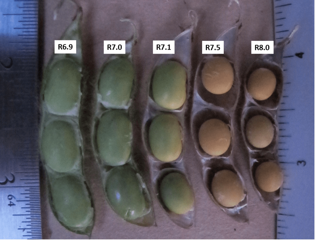 - Soybean with leaves beginning to yellow and pod membrane still attached to seeds (R6.5) needs 1.9” (approx. 10 days to maturity)