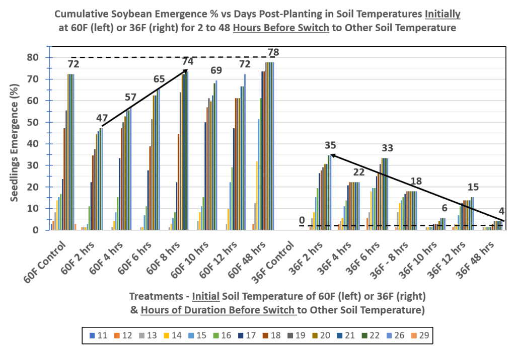 The 36F to 60F switch showed that a warming trend in the first 2-6 hours led to greater emergence. We don’t recommend planting into soils at 36F, but it served as a nice low extreme. We would anticipate the emergence would improve if the soil temp was 40F or mid-40’s with a warming trend.