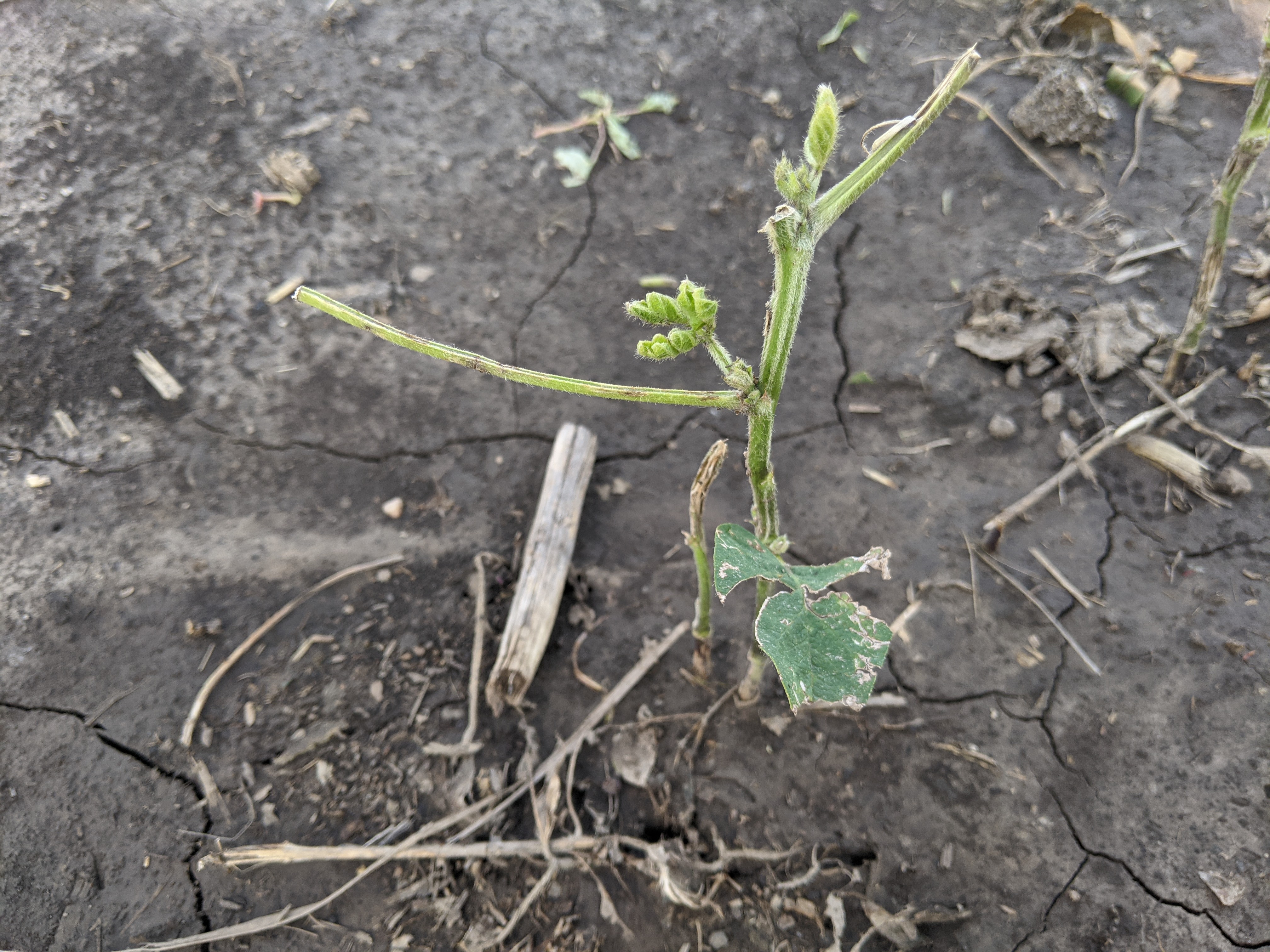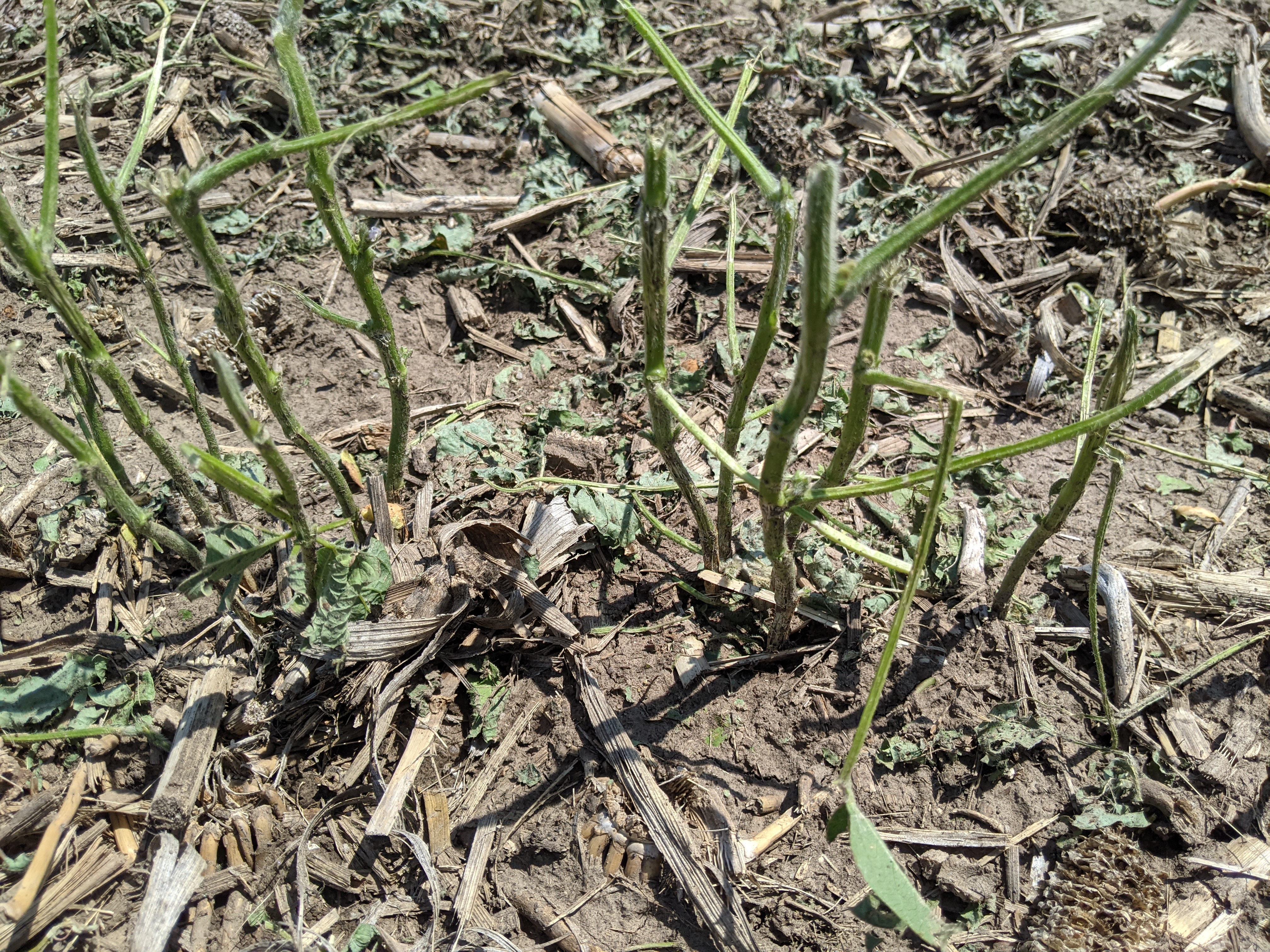 Same area of soybean field Wednesday afternoon (after previous night’s storm) and Sunday afternoon. Soybean reduced to sticks with new growth occurring Wednesday afternoon (first two pictures). New flowers occurring on soybean sticks and more growth observed Sunday afternoon (last two pictures).