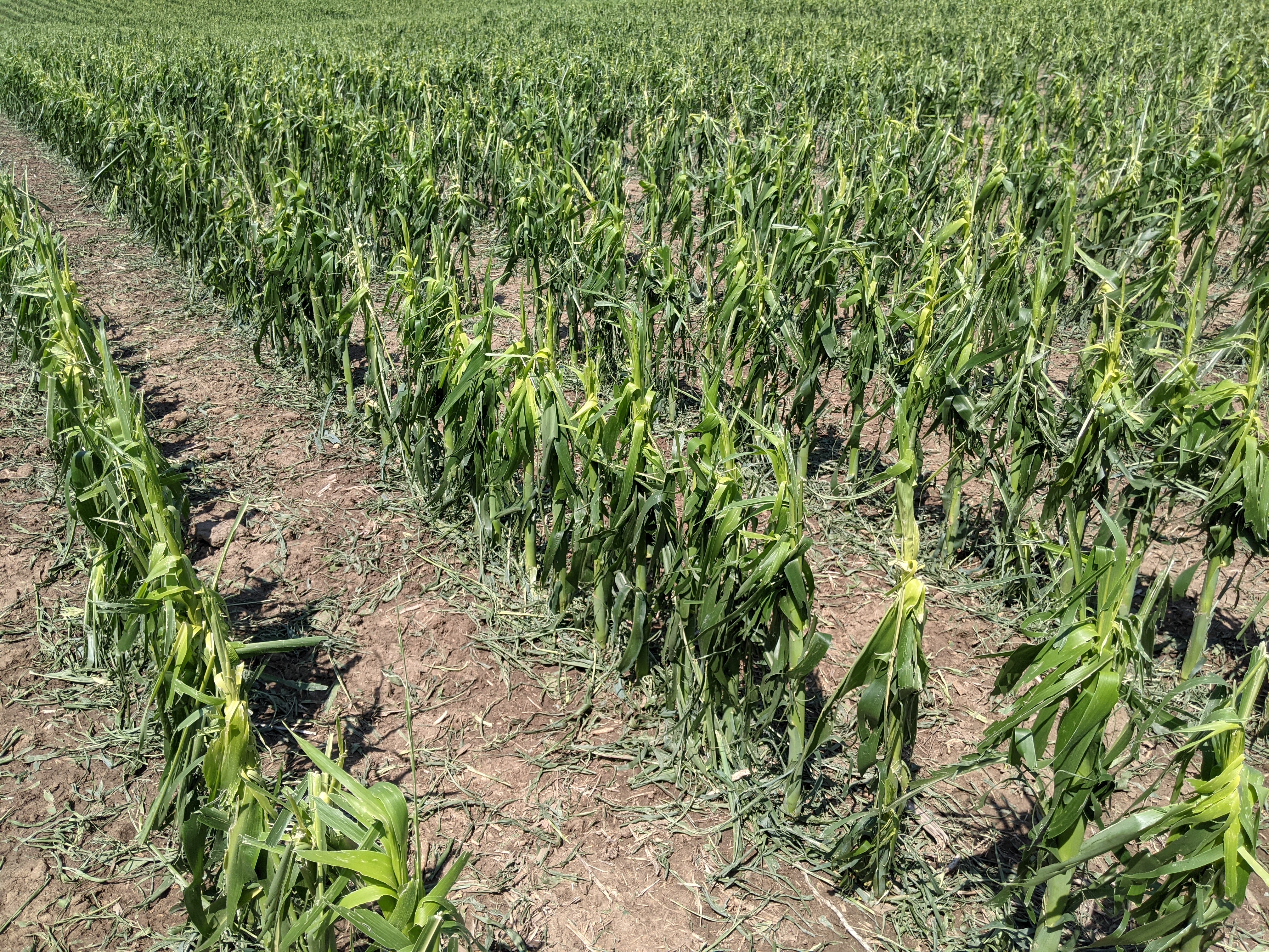 Plants in this V10-11 field were shredded back to the growing point. In this case, the hail damage to stems was mostly on the outside surface of the plants.