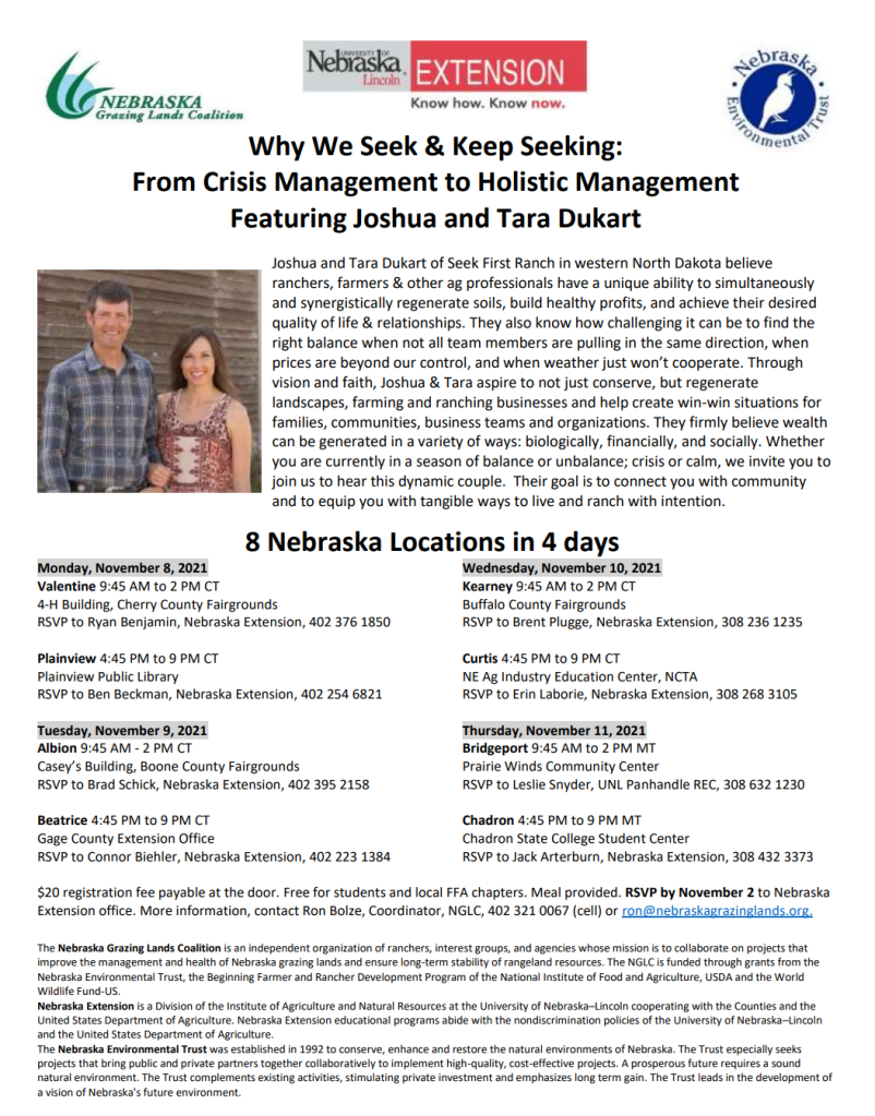- Thursday, Nov. 11 near Mead at the Eastern Nebraska Research, Extension and Education Center, 1071 County Road G., Ithaca, Nebraska. (Face coverings required.) (Livestream option available for Nov. 11. Register here to receive the Zoom link.)