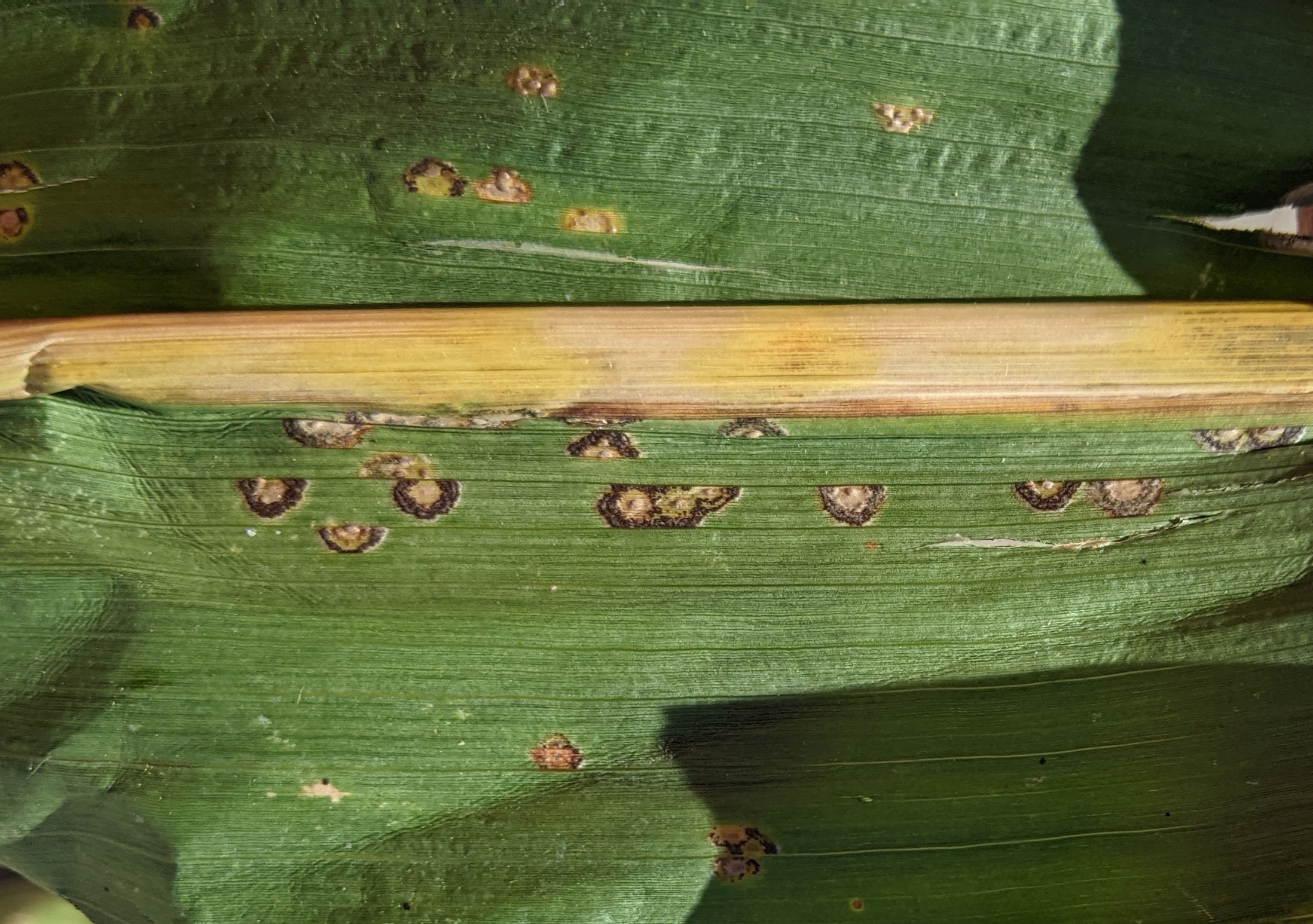 (Phtotos below: left-hand photo is tar spot, one lesion, very low incidence. Doesn’t scrape off leaf. Right-hand photo is southern rust teliospores; you can see the raised pustules looking closely in the photo and can rub them off.)