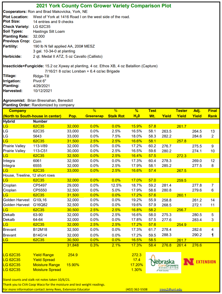 The York County Corn Grower plot and several on-farm research studies were harvested this past week. Thank you to Ron and Brad Makovicka for planting, harvesting, and hosting the corn grower plot and to all the seed companies who participated! The plot averaged 277 bu/ac on 190 lbs N of fall applied anhydrous and 3 gal of starter. That’s a great nitrogen efficiency per bushel produced! You can view the results at jenreesources.com or can pick up a hard copy of the results at the York Co. Extension Office.