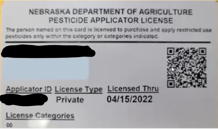 Your new license will indicate that you received private pesticide safety training with the words “General Agriculture” and/or a code (00) printed on it. If you choose to get certified in either Soil or Non-Soil/Structural Fumigation, your license will show these as 01a and 11, respectively.