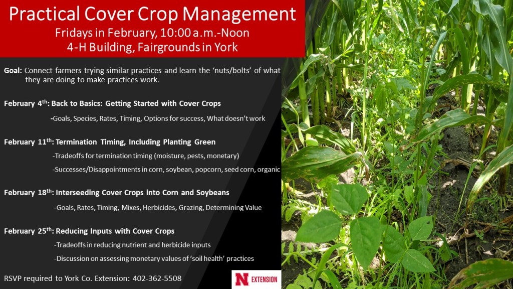 Practical Cover Crop Management: I so appreciated Keith Berns sharing at our Practical Cover Crop meeting last Friday! The discussion and questions throughout that time is what I was hoping for with this meeting in all of us learning from each other and together. I’m not recording them and my goal with these meetings is the discussion/interaction/connections, so if you’d really like the information, it’d be most helpful to attend in person. This next meeting on Friday, Feb. 11 from 10-Noon at the 4-H Building in York will be on termination timing of cover crops, including planting green. I’ve asked a number of farmers to share their experiences as each does things slightly differently in their corn/soybeans with tillage practices, timing, herbicides/lack of. This is very informal with just discussion and please come with your questions and willingness to share as well! It is helpful for me to have RSVP at 402-362-5508 but I do allow for walk-ins.