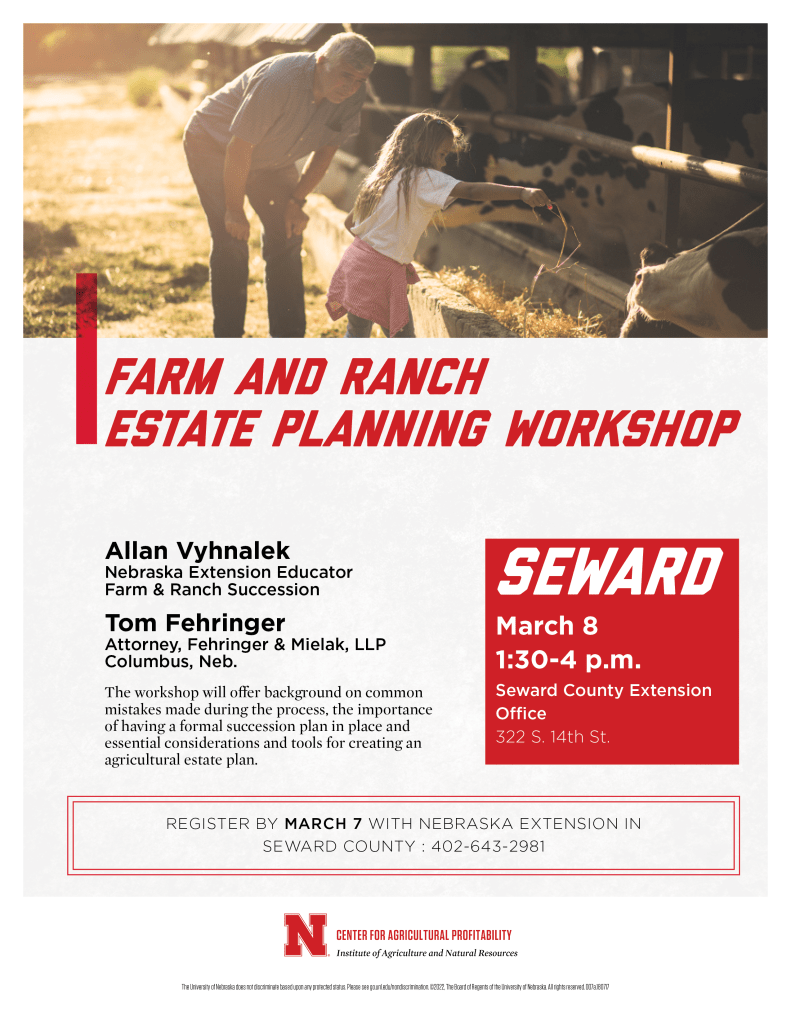 Estate Planning Workshop March 8: We’re excited to offer an estate planning workshop for farmers and ranchers from 1:30-4:00 p.m. on March 8 at the Seward County Extension Office (322 S. 14th St. in Seward). My colleague, Allan Vyhnalek, an extension educator for farm and ranch transition and succession, will offer tools and strategies to effectively plan, start and complete estate plans, offer background on common mistakes during the process, and highlight essential considerations for creating and carrying out estate and succession plans.