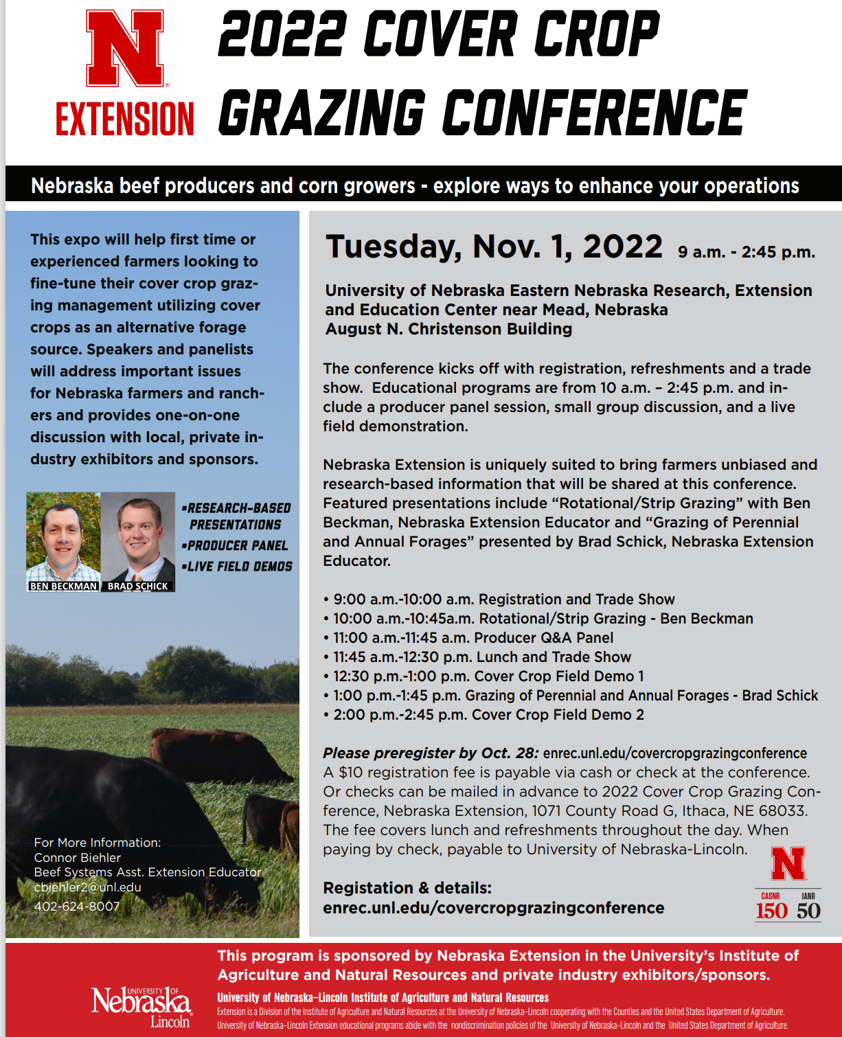 Cover Crop Grazing Conference will be held November 1st at the Nebraska Research and Extension Center near Mead (1071 Co. Rd. G). This conference is designed for crop and livestock producers with a trade show, speakers, producer panel, and cover crop field demonstrations. The day begins at 9 a.m. with registration and a trade show with the program running from 10 a.m. to 2:45 p.m. Speakers include Ben Beckman (Rotational/Strip Grazing) and Brad Schick (Grazing of Perennial and Annual Forages). There is a $10 registration fee payable via cash or check at the conference to cover lunch and refreshments. RSVP at: https://enrec.unl.edu/covercropgrazingconference/. If interested in exhibiting in the trade show, please contact Connor Biehler at cbiehler2@unl.edu or 402-624-8007.