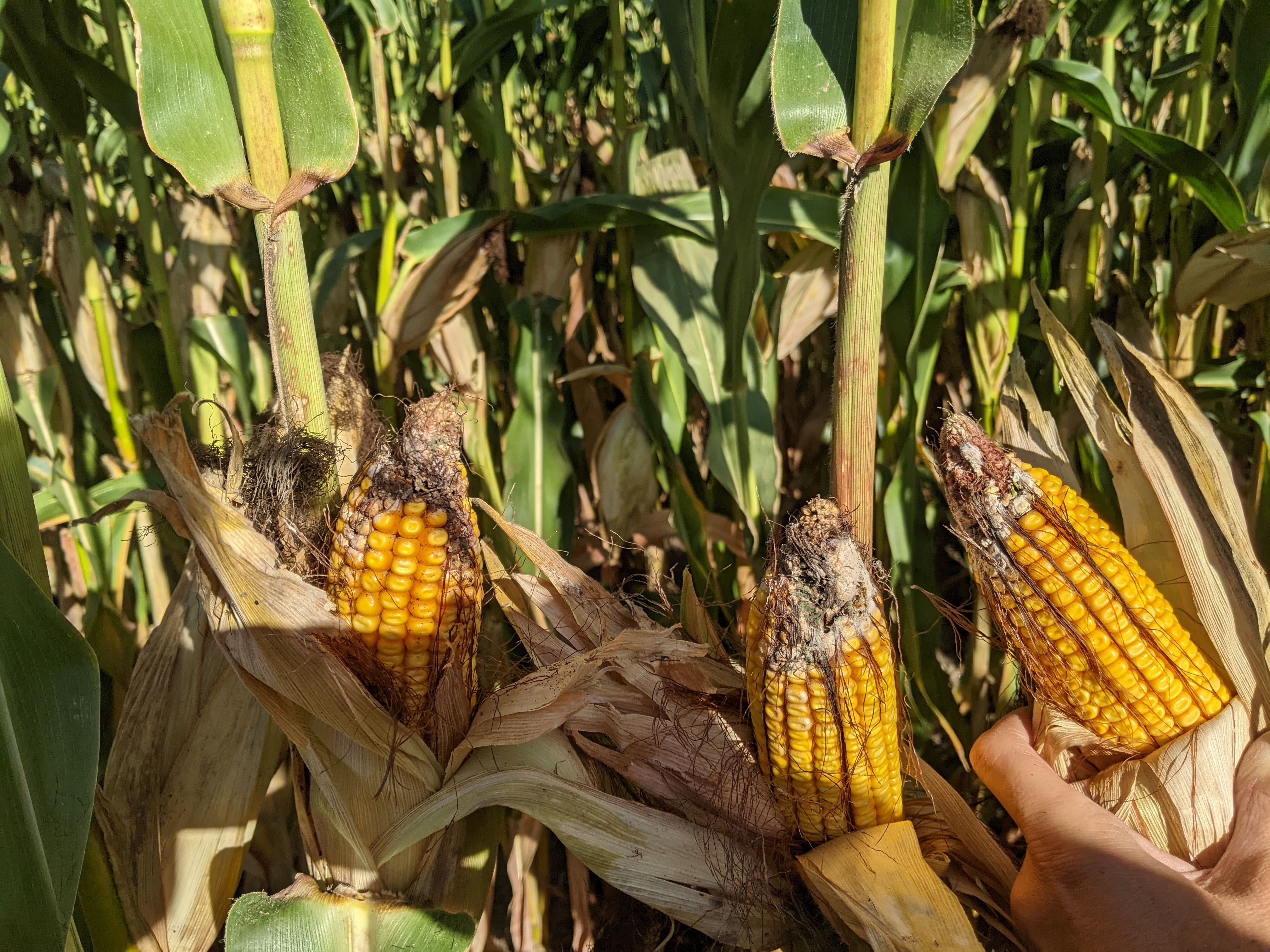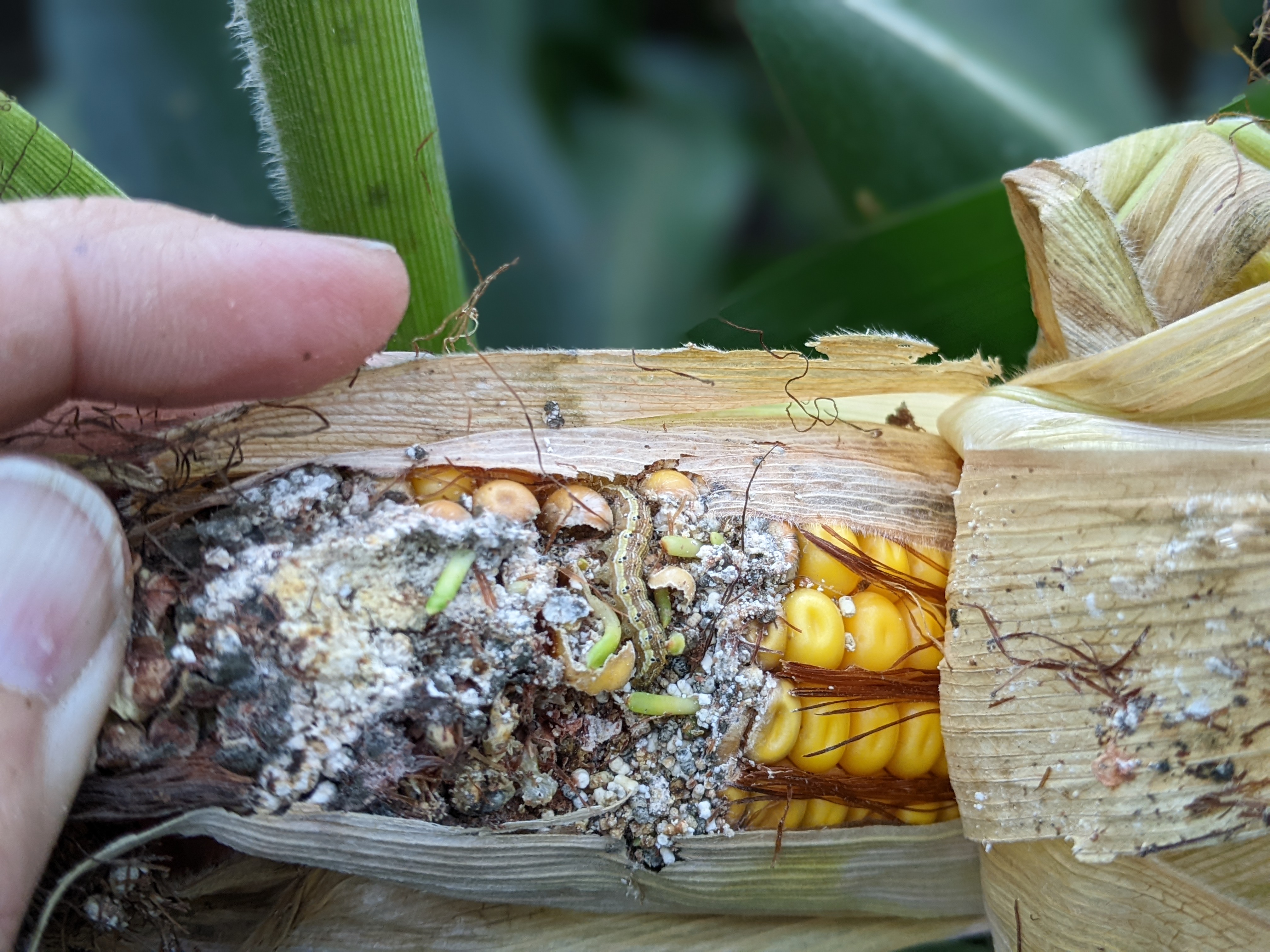 We knew replant crops would be a target for insect and disease pressure. It’s hard to see the corn earworm impact crops for such a large area as what they have this replant corn. Even fields that were sprayed once still have ear damage on a good 50% of the plants. The earworm feeding has allowed entry of fungi such as those causing white/pink Fusarium ear mold to varying degrees on the ears. Also seeing some blue-gray Penicillium ear mold and some sprouted kernels. Unfortunately, there wasn’t much we could practically do about it and there’s nothing we can do now till harvest. The presence of mold does not automatically mean the presence of mycotoxins. For harvest, it’ll be important to set combines to blow out any lighter, damaged kernels. Will share more on grain management in storage later.