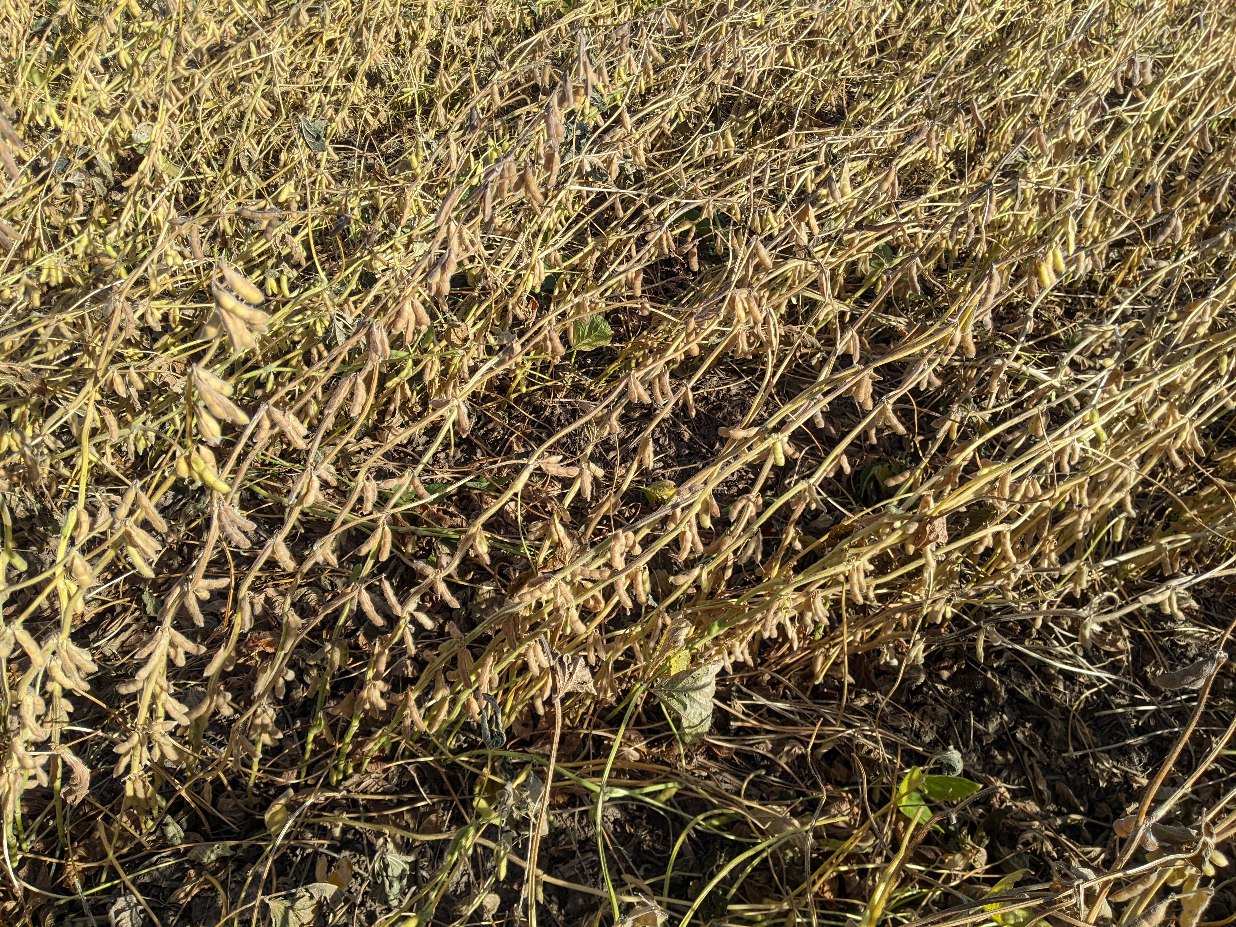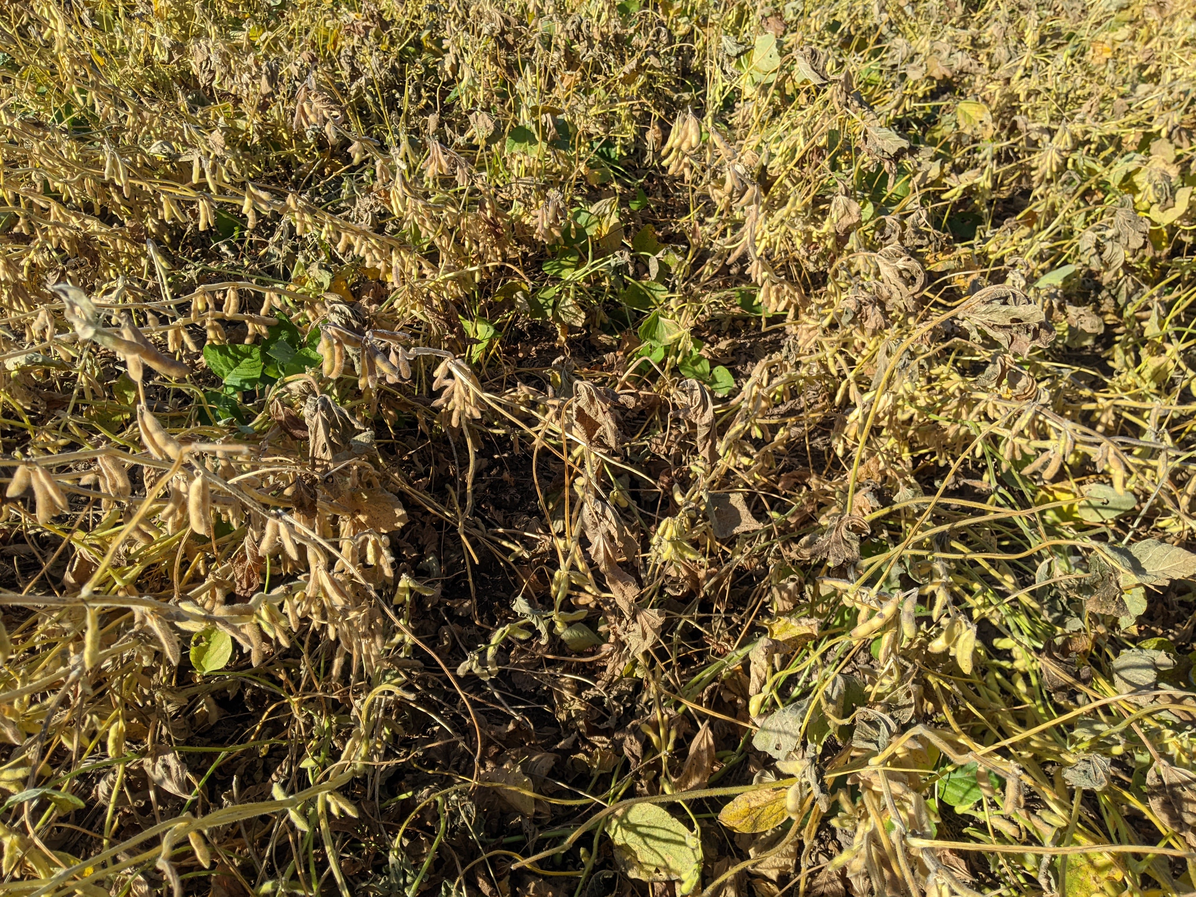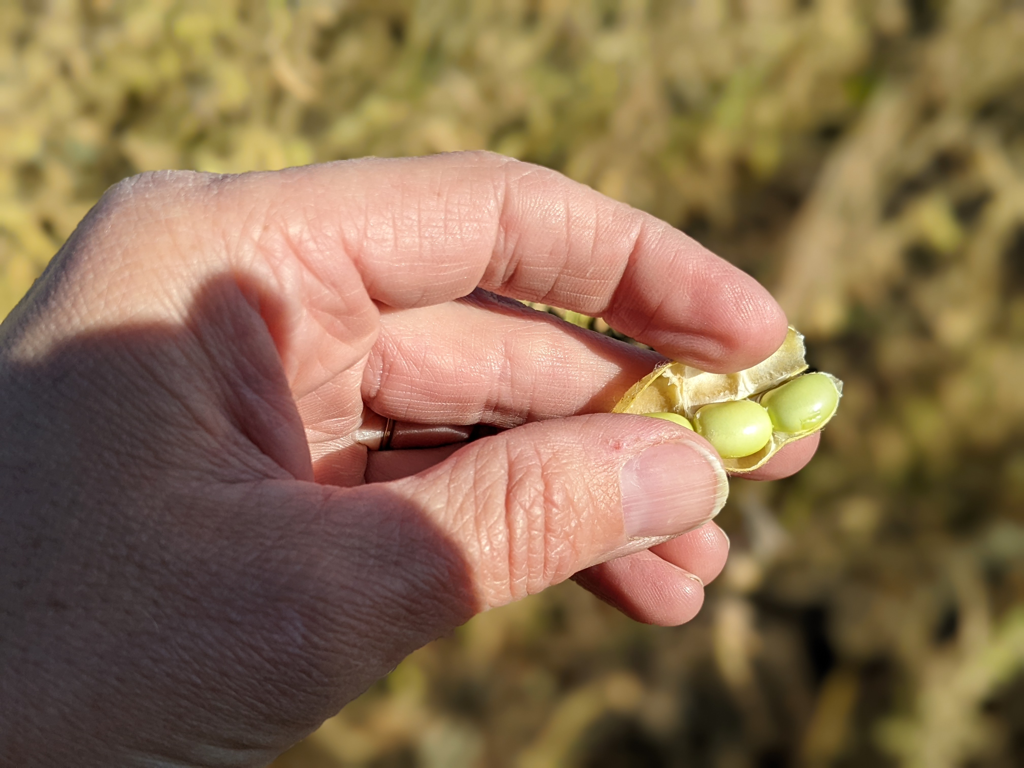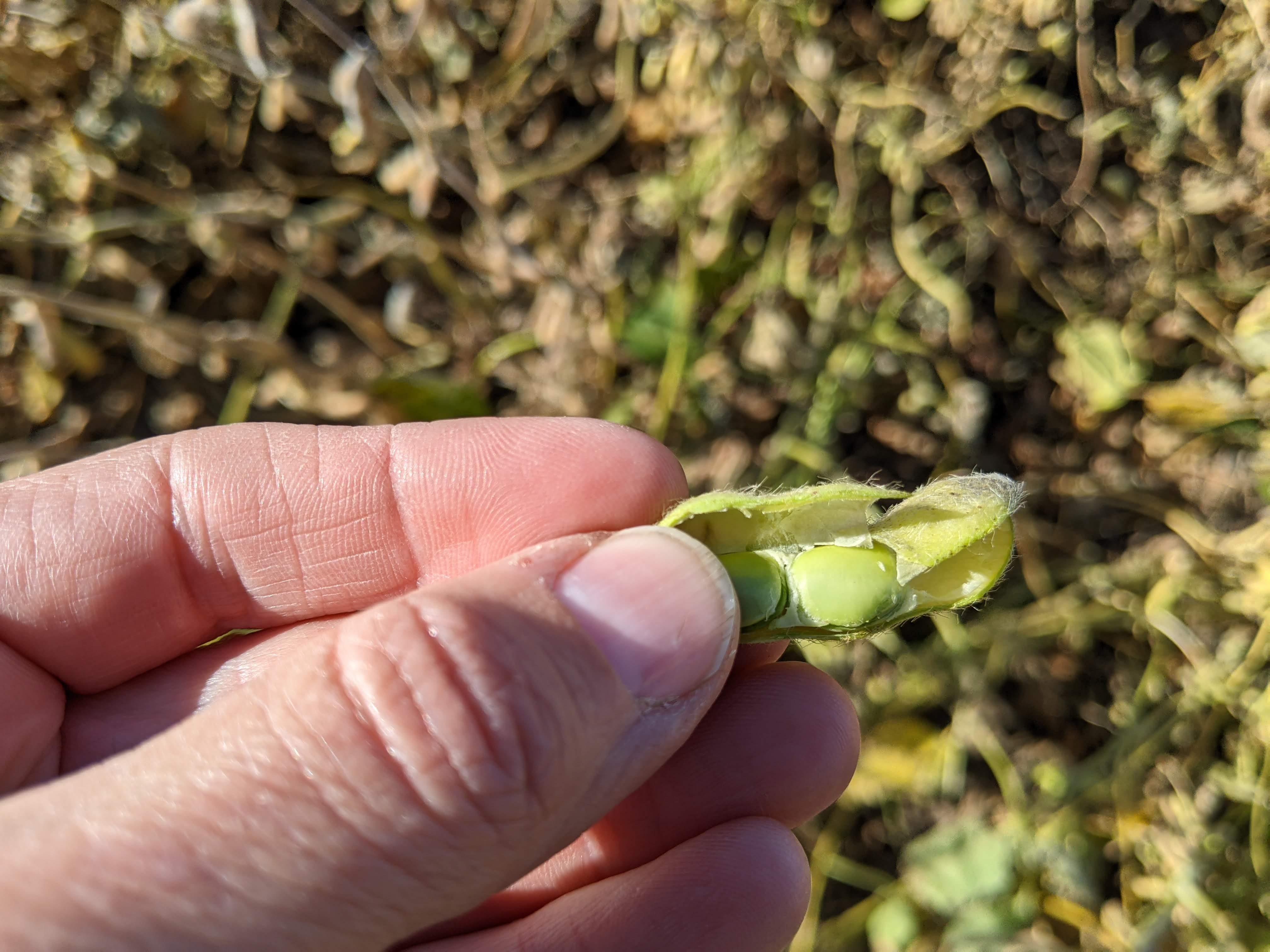 I didn’t pop into many soybean fields but this is the range of pods/seeds coloration that could be expected in those that were greener with leaves remaining on them. These beans were still filling and pods were changing color. Several sources say the seed greenness should lesson over time if the stem was not completely froze (which was observed this past week with green color lessening) and/or with aerated storage after 4-6 weeks.