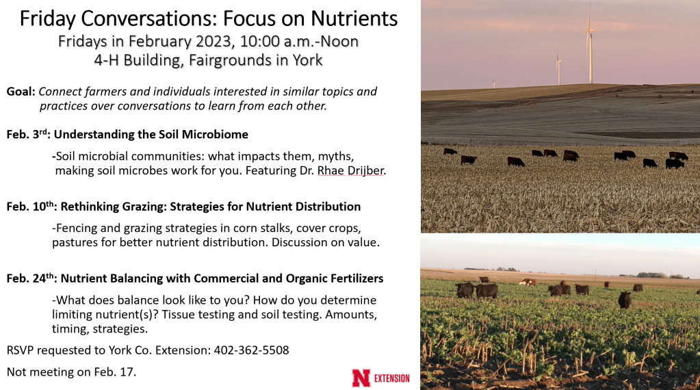 Understanding the Soil Microbiome: For those interested, this Friday, March 3, will be our last Friday conversation on ‘understanding the soil microbiome’ at the 4-H Building in York from 10 a.m.-Noon. Dr. Rhae Drijber, UNL soil microbiologist, will kick off our conversation and I’m looking forward to the discussion. If you plan to attend, please let us know at 402-362-5508.