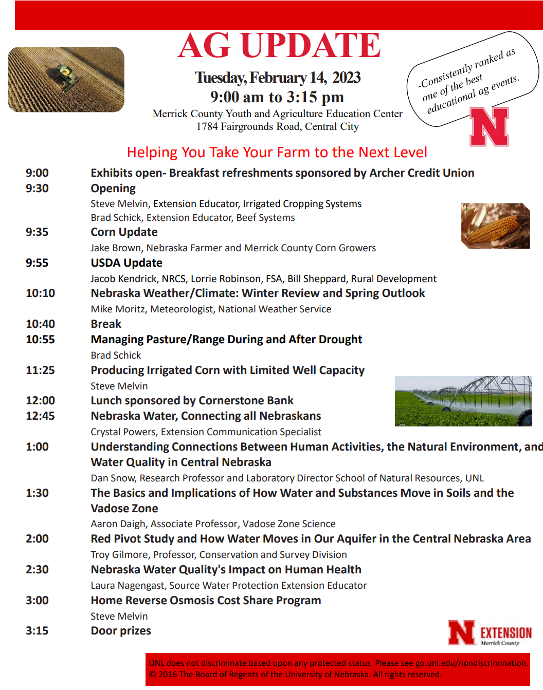 Feb. 14 Ag Update Merrick Co.: Nebraska water quality’s impact on human health and more, Ag Update 2023 will be held Tuesday, Feb. 14 at the Merrick County Youth and Agriculture Education Center, 1784 Fairgrounds Rd, Central City. It will start with breakfast refreshments provided by Archer Credit Union and exhibits opening at 9 am. The event has a great lineup of speakers and exhibits, including “Nebraska Water, Connecting all Nebraskans” with Crystal Powers, “How Water and Substances Move in Soils and the Vadose Zone” with Aaron Daigh, and “Home Reverse Osmosis Cost Share Program” with Steve Melvin. Lunch will be provided and sponsored by Cornerstone Bank. The day will wrap-up about 3:15 p.m. with door prizes. RSVP to Steve Melvin at (308) 946-3843 or at the Merrick County Extension site.