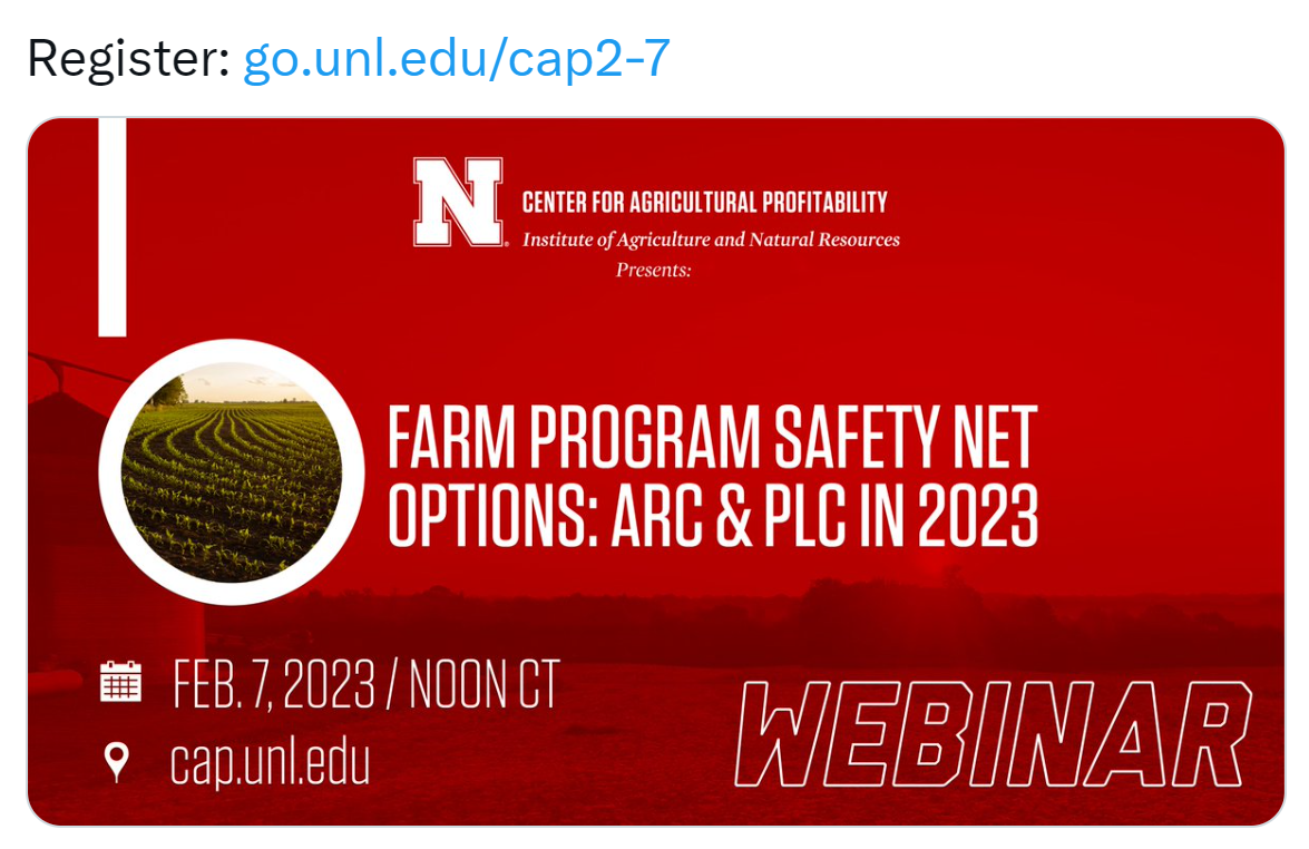 Producers can learn about the ARC and PLC options during a UNL Center for Agricultural Profitability webinar scheduled for 12 p.m. CT on Tuesday, Feb. 7. Cathy Anderson, production and compliance programs chief for the Nebraska Farm Service Agency, and Brad Lubben, extension policy specialist in the University of Nebraska-Lincoln’s Department of Agricultural Economics, will present and share information relevant for producers, ag professionals and ag stakeholders. Registration for the webinar is free and can be found at: https://go.unl.edu/cap2-7.