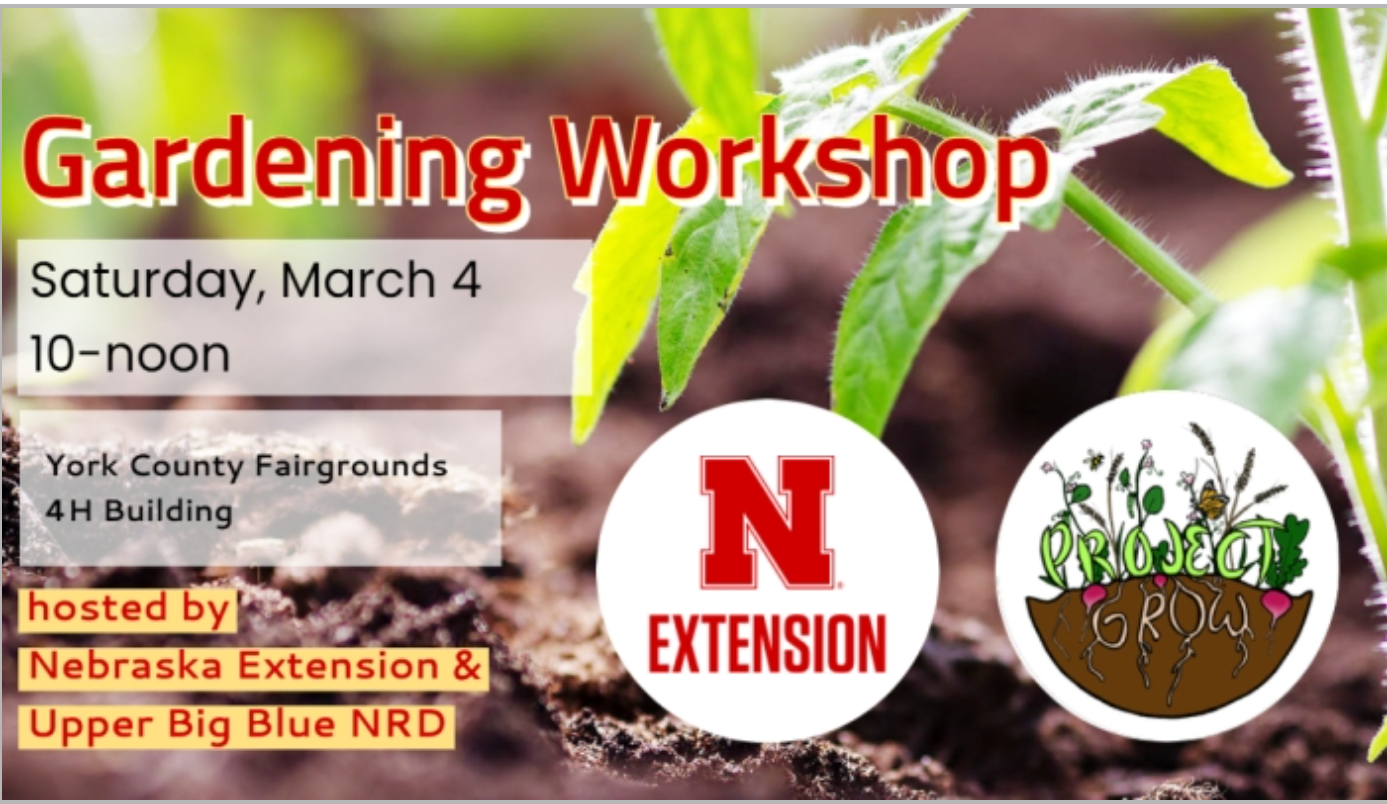 March 4 Gardening Workshop will be held from 10 a.m.-Noon at the 4-H Building in York. Sarah Browning, Extension Educator, will share on vegetable planting basics such as site selection, rotational plan, summer care, and troubleshooting problems such as insects/diseases/weeds. Please bring your questions! This workshop is sponsored by the UBBNRD and Nebraska Extension; there’s no charge and refreshments are provided. No RSVP is required, but it does help with refreshments if you could please let us know at 402-362-6601 or 402-362-5508. If you’re interested in gardening, but don’t have the space at home, check out the Project GROW community garden in York. Plots are available for the 2023 growing season. You can reserve your space now or come to the Gardening Workshop and sign up in person.