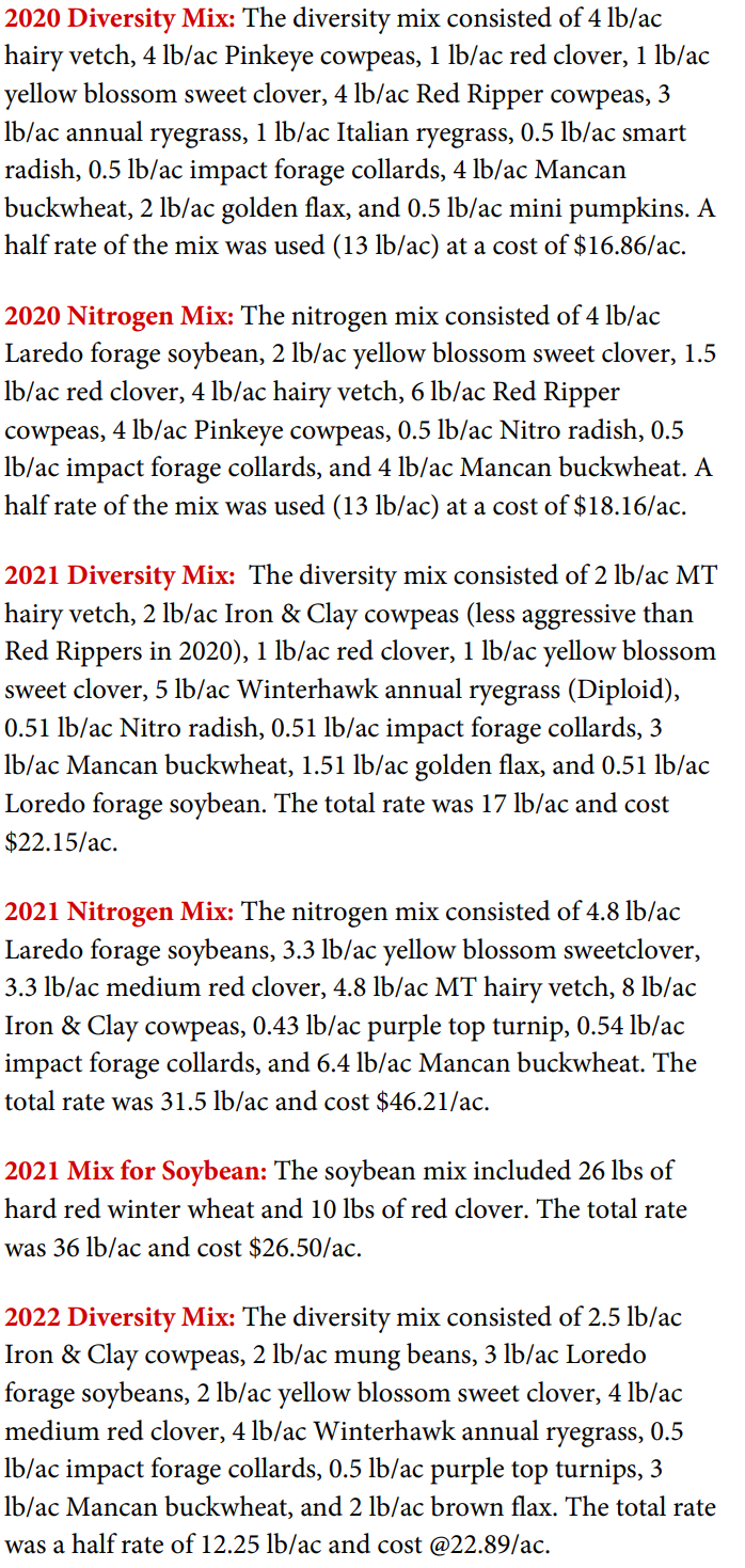 Studies such as this will be shared by area farmers starting this week at On-Farm Research Updates (Feb. 15 at Holthus Conv. Center in York)! RSVP at: go.unl.edu/2023ofr. Since 2019, a group of area farmers have been interseeding cover crops into early season corn (V3-V4) and soybean (VE-V2). The goals for interseeding cover crops into cash crops include: providing nutrients for the cash crop, weed control, erosion control, diversity, reducing inputs such as fertilizer and chemicals, and providing forage for grazing after harvest. Interseeding of cover crops can also occur at other growth stages, such as at male row destruction in seed corn or at senescence in late-season corn and soybean. This article will focus on our results from early-season interseeding of cover crops into corn and soybean.