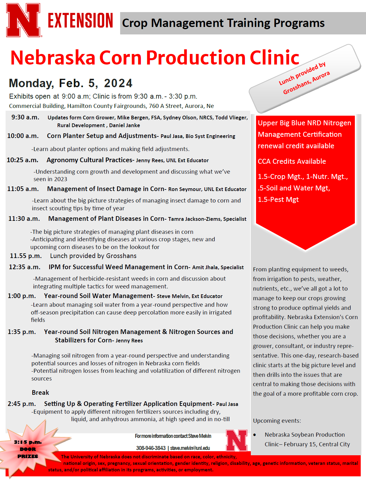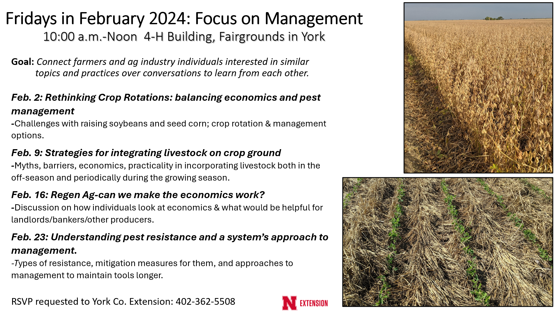 Upcoming Events: Friday (16th) conversation on economics of RegenAg from 10-noon at 4-H Bldg in York. RegenAg Conf. Feb. 28th at Concordia College in Seward (RSVP to 402-362-6601). On-Farm Research Update in York at Holthus Convention Center Feb. 27th (RSVP: https://go.unl.edu/bhdw). Also, York County Corn Growers is having our tour on Feb. 21st (RSVP to 402-362-5508 if interested).
