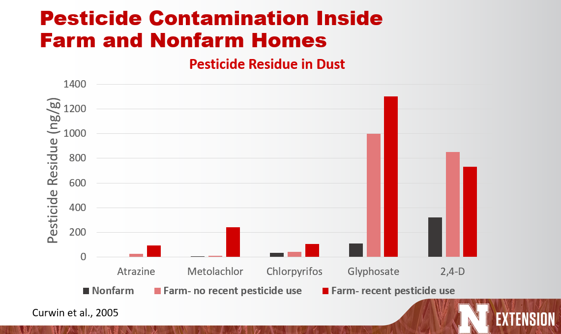 This information is important as we think about how any of us can be tracking pesticides through our homes. Pesticides are applied to fields but also to our lawns and sometimes even to driveways. Think about our shoes walking through all these areas.