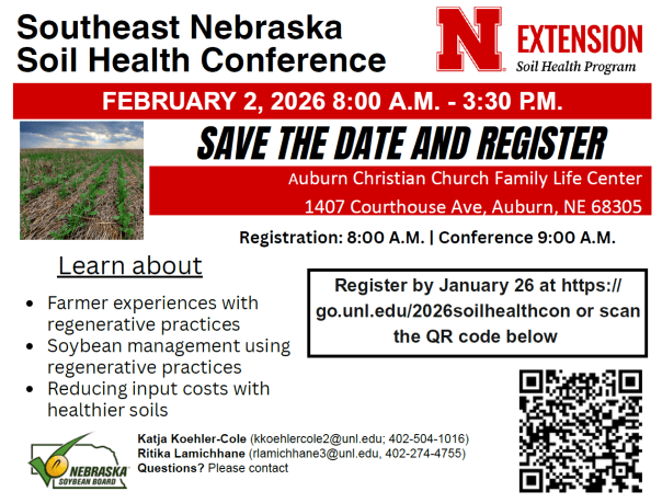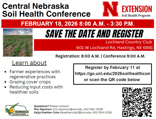 Central Nebraska Soil Health Conference will be held on Feb. 18th at the Lochland Country Club in Hastings. The conference will run from 9 a.m. to 3:30 p.m., with registration beginning at 8 a.m. Local growers will share information on converting crop ground for grazing, regenerative ag practices in raising soybean, and a producer panel. The keynote will share on biochar in ag. No fee, registration is requested for lunch count: https://go.unl.edu/kx80.
