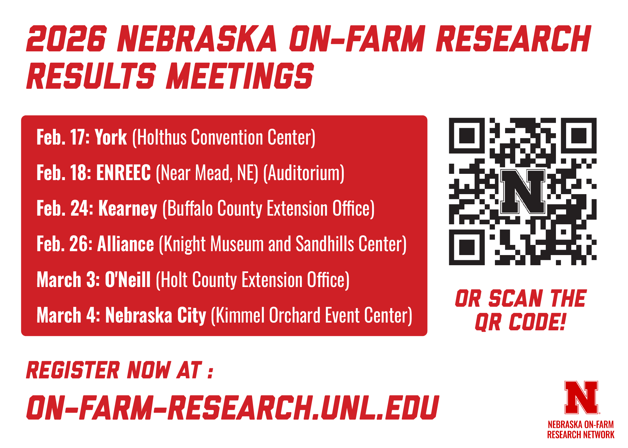 On-Farm Research Updates will be held Feb. 17th in York at the Holthus Convention Center, Feb. 18th at ENREEC near Mead, and Feb. 24 at the Extension Office in Kearney. The program at each location begins at 9 a.m. with registration at 8:30 a.m. Hear from the producers who conducted the research to learn what they tried and the results they found. No charge, but please RSVP at: https://on-farm-research.unl.edu/.
