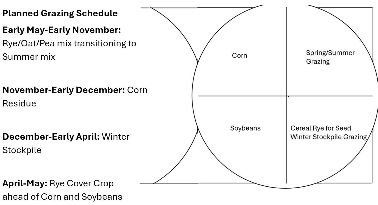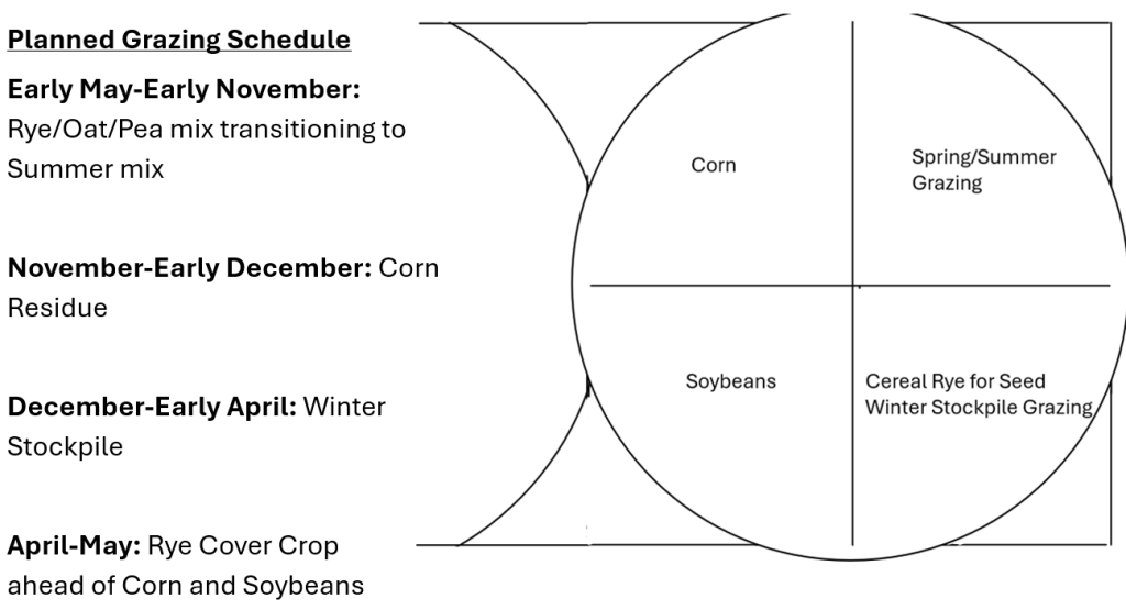 On one quarter he planted corn, the next quarter was a year of annual forages for strip grazing, the next was cereal rye for seed followed by winter stockpiled annual forages, and the final was soybeans. The pivot corners consist of pasture and one farmstead. The crops on each quarter are rotated clockwise each year. For example, the quarter that was strip-grazed annual forages in 2024 was planted to corn in 2025. Volunteer rye and vetch were grazed before corn was planted in that area and the cows were moved onto oats/peas he planted into the annual forage quarter. As they were dying out, he followed the cows with planting an annual forage summer mix that contained multi-species but was heavier on millets so he didn’t have to worry about removing cows during light frosts (he was avoiding the potential of prussic acid poisoning by using the millets instead of sorghum species). Now the cows are on the winter stockpiled forage that was also a muti-species mix but heavier on the sorghum species side. For a stocking rate, he figures 1 pair per acre (around 33 pairs if he stayed on this quarter system). This would also be a great system for stockers.