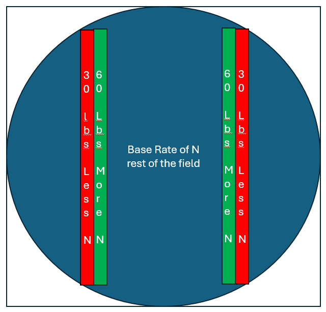 Then somewhere on half of your field, apply a strip of 30 lb N/ac less than your base rate and a strip right next to it of 60 lb N/ac greater than your base rate. Repeat these two strips on the other half of the field. For example, if your base rate is 100 lb N/ac, the low base rate would be 70 lb N/ac and right next to it would be a high strip of 160 lb N/ac. Make sure there’s a high/low paired strip on each side of your field.