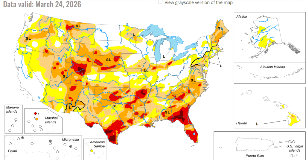 What’s also interesting is that currently 77.1% of the entire U.S. is abnormally dry/in drought. That’s actually the highest for last week on record for the U.S. I could find. The other closest years for entire U.S. drought were 72% in 2022; 67% in 2025; and 65% in 2002, 2013, and 2021. We all know it’s dry and we’ll keep praying for much-needed rain.