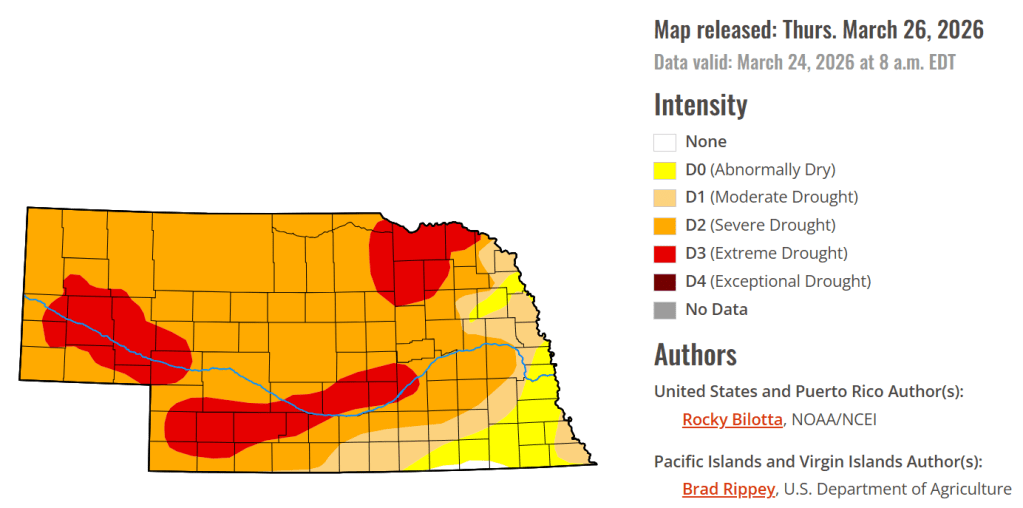 Drought: As of Thursday’s drought monitor release, 99.6% of Nebraska is abnormally dry/in drought. This same week in 2023 was also at 99.6% and similar to 2025 at 98.2%.