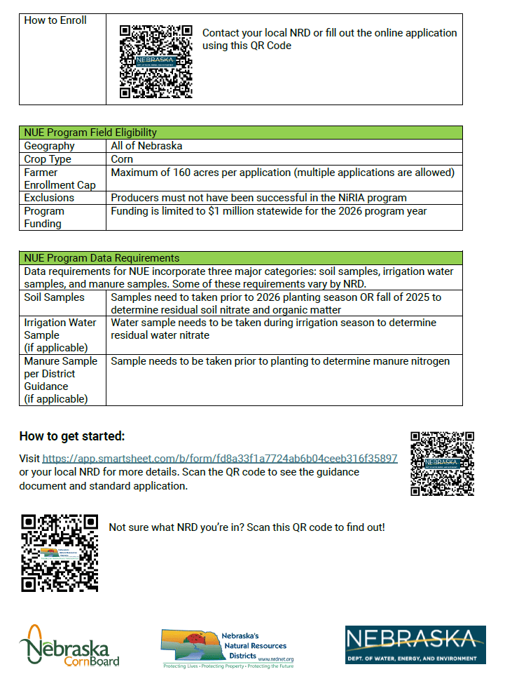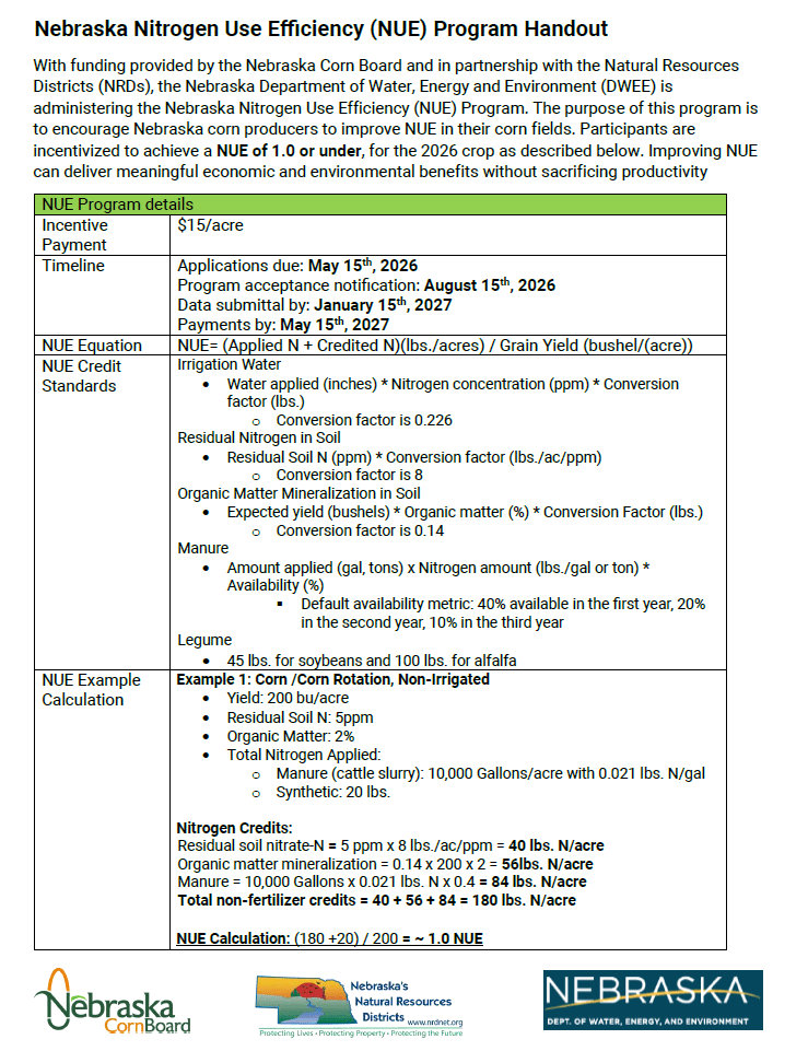 2026 Nebraska Nitrogen Use Efficiency (NUE) Program: With funding provided by the Nebraska Corn Board and in partnership with the Natural Resources Districts (NRDs), the Nebraska Department of Water, Energy and Environment (DWEE) is administering the Nebraska Nitrogen Use Efficiency (NUE) Program. The purpose of this program is to encourage Nebraska corn producers to improve NUE in their corn fields. Participants are incentivized to achieve a NUE of 1.0 or under, for the 2026 crop as described below. Improving NUE can deliver meaningful economic and environmental benefits without sacrificing productivity.