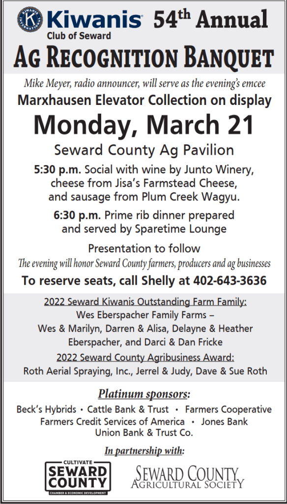 Seward County Ag Banquet: The 54th Annual Kiwanis Club of Seward Ag Recognition Banquet will be held on Monday, March 21 at the Seward County Fairgrounds. A social with wine, cheese, and sausage will be at 5:30 p.m. with prime rib dinner at 6:30 p.m. To reserve seats, call Shelly at 402-643-3636.