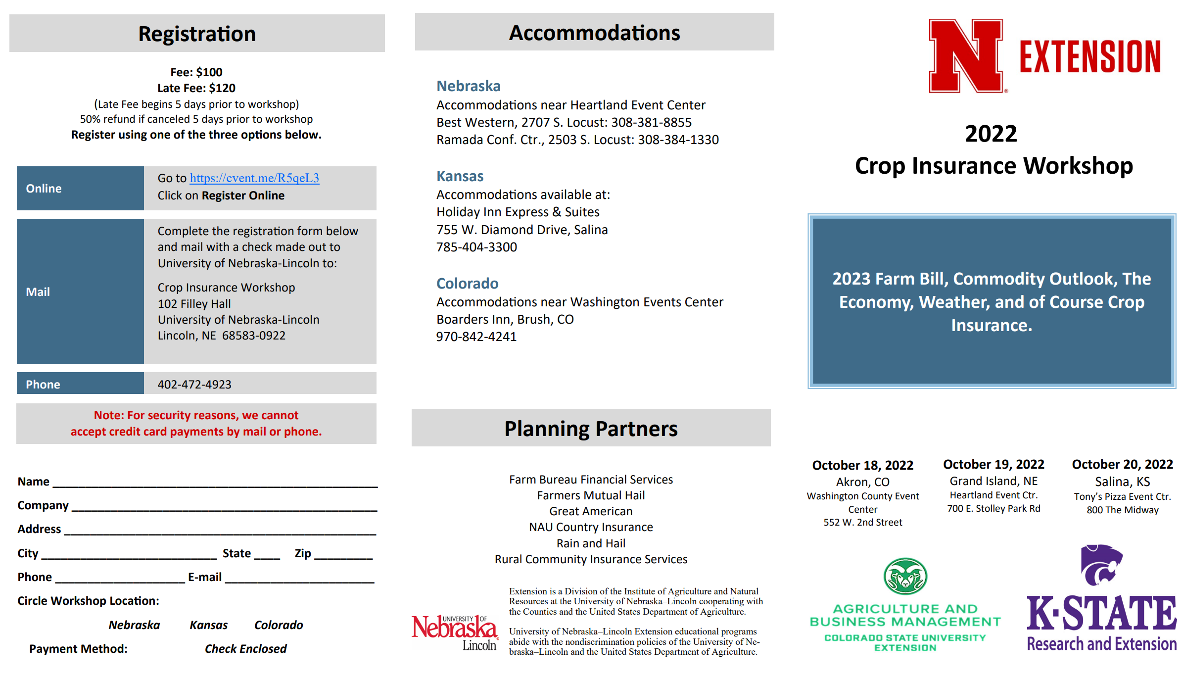 Crop Insurance Workshop will be held Oct. 19 at the Heartland Event Center in Grand Island. Register at: https://cvent.me/R5qeL3 or 402-472-4923.