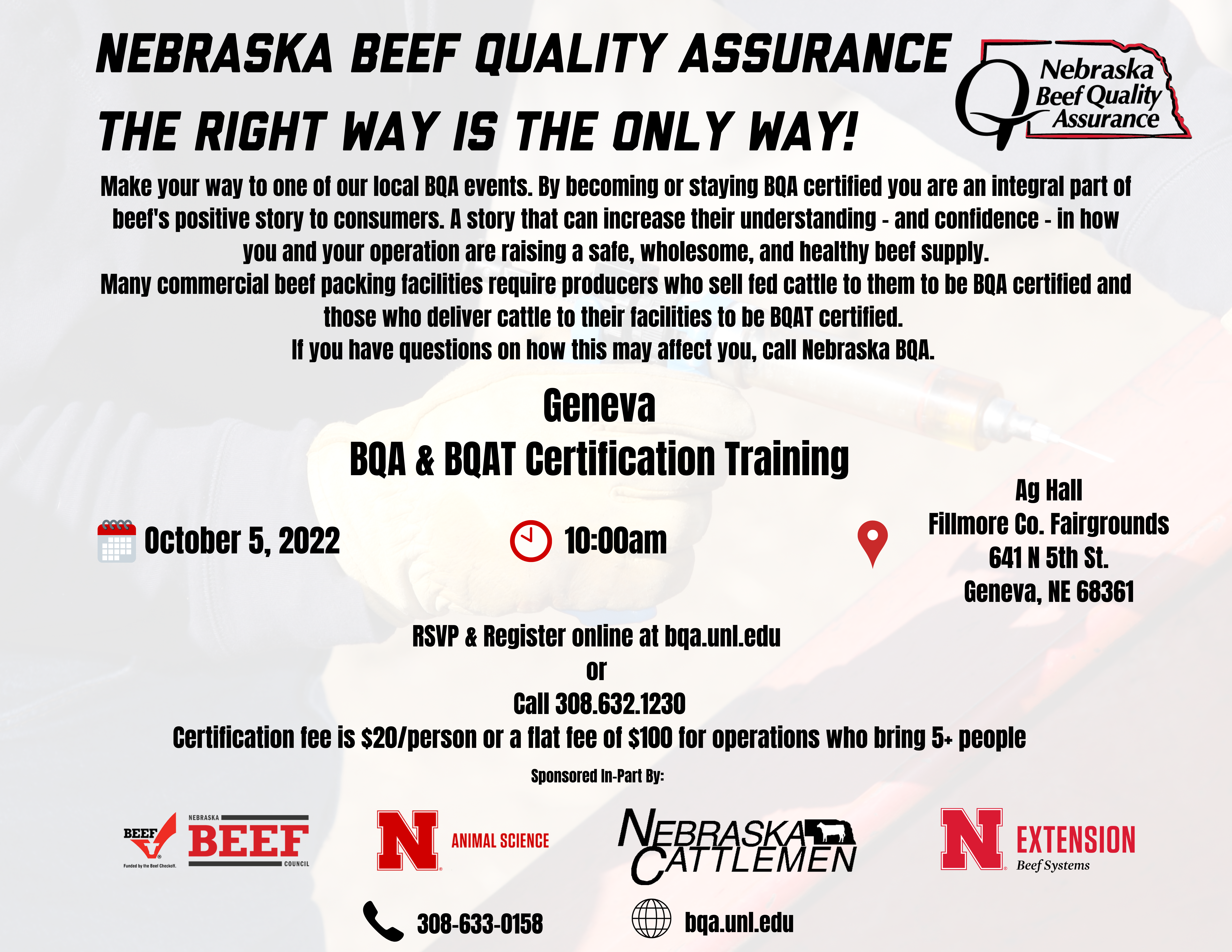 Beef Quality Assurance (BQA) and BQA transport training will be held Oct. 5th from 10 a.m.-Noon at the Fairgrounds in Geneva. You can RSVP at https://bqa.unl.edu/training-events.