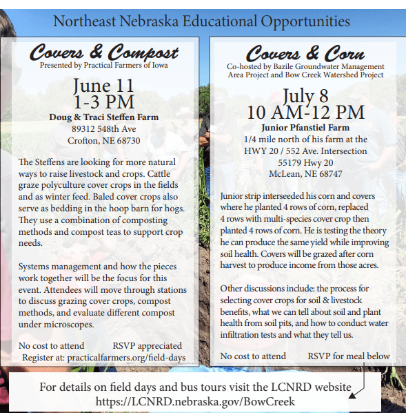On July 8 from 10 a.m.-Noon, Junior Pfanstiel is hosting a covers and corn tour on his farm near McLean, NE. Lunch is also included. Junior alternated 4 rows of corn with 4 rows of multi-species cover crops throughout his field with the goal of obtaining the same yield on fewer acres while also having grazing acres. Please RSVP to: (402) 254-6758.