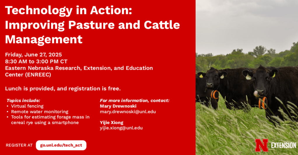 Summer Grazing Field Day: Alex Daake in the Utica area is hosting a field day on Tuesday, August 5th from 4-6 p.m. at 4136 Superior Rd, Utica. He took a pivot and divided it into quarters. One quarter is soybean, corn, grazed mix for 1 year, grazed mix for 2 years. Cereal rye is also taken for seed after the grazing. He rotates the quarters each year. The field day will primarily focus on how Alex is grazing covers, the cover crop mixes used, and how he feels it’s improving the soil. Come learn about what he’s doing, why, and the economics. On the quarter with corn was 2 years of previous grazing. He has an on-farm research nitrogen study on that ranging from 0-150 lb N/ac. He is also using satellite imagery from Sentinel Nutrient Mangement to determine which plots, if any need additional nitrogen. It will be a great afternoon of learning and sharing! Please RSVP to me at jrees2@unl.edu or 402-440-4739 if you’re interested in attending. Cookies and drinks will be provided.