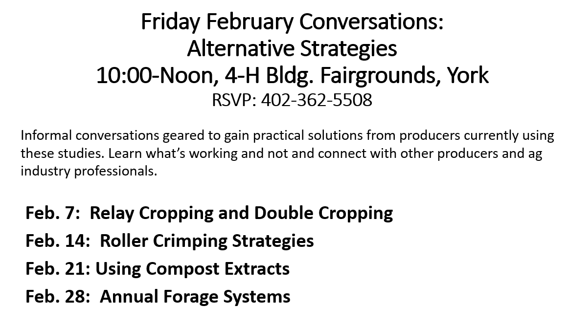 If interested, our next topic on February 9th (10-noon at the 4-H Bldg in York) is Strategies for integrating livestock on crop ground both in the off-season and during the growing season.