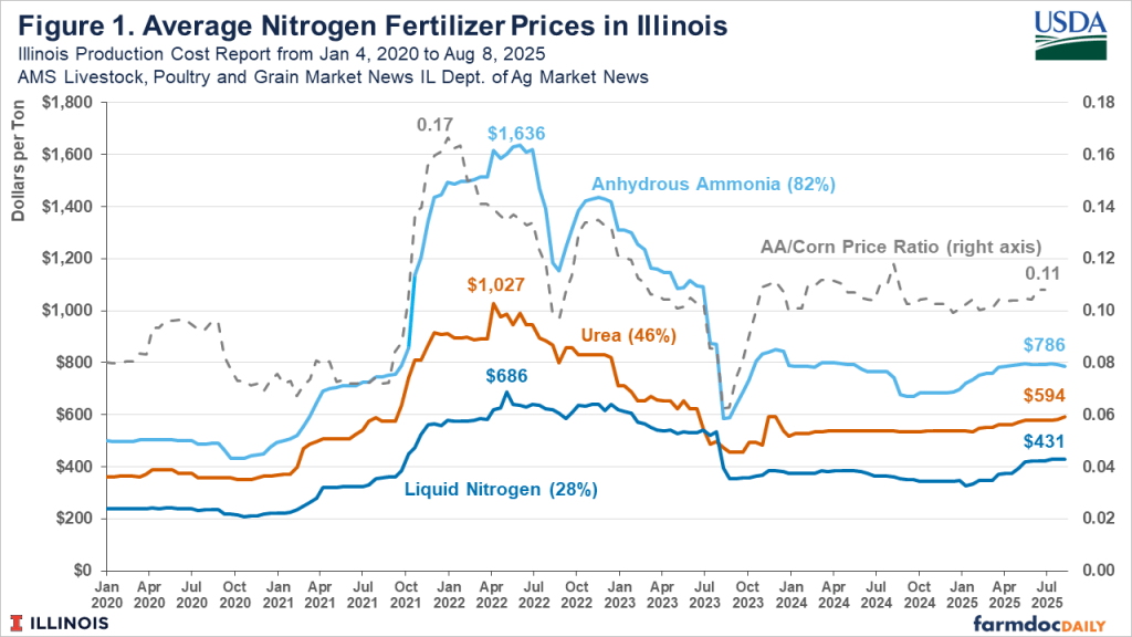 Relative fertilizer prices provide another important perspective. The ratio of anhydrous to monthly national cash prices for corn reported by the USDA is also included in Figure 1 (right axis). In calculating the ratio, the anhydrous price is converted to dollars per pound of nitrogen based on the average N content of 82%. For example, the latest anhydrous price of $786 per ton is equivalent to $0.48 per pound of nitrogen ($786/(2000*0.82) = $0.48).