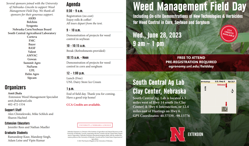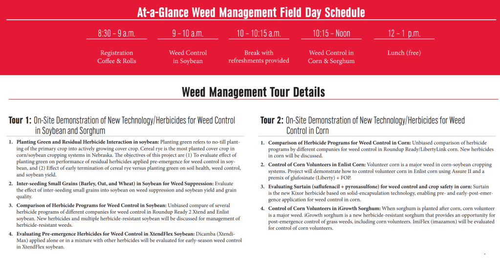 Weed Science Field Day June 28th at South Central Ag Lab near Clay Center where a number of corn and soybean herbicide programs are showcased. Herbicide programs with planting green, interseeding cover crops also shown. 9 a.m.-1 p.m. (Reg. at 8:30 a.m.). RSVP: https://agronomy.unl.edu/fieldday