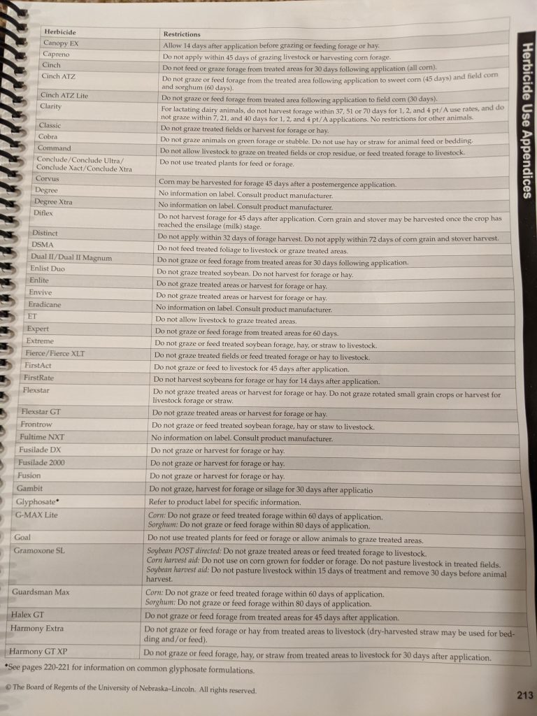 For non-irrigated crops, forage has been on my mind all year. Thus, why I wasn’t recommending full chem loads and side-dress nitrogen applications depending on the individual field situations. My thought has been these non-irrigated crops become opportunities for grazing where that’s applicable. There’s considerations first such as being released by crop insurance, waiting till the crops have died as today’s hybrids and varieties are more resilient than the past, and checking herbicide grazing restrictions (I have pics of those from the UNL Weed Guide on my blog). I’ve been talking to a lot of people about how to graze corn and soybeans or other options and will share in future weeks if we need to go there.