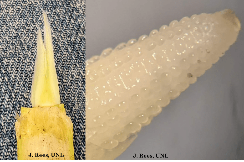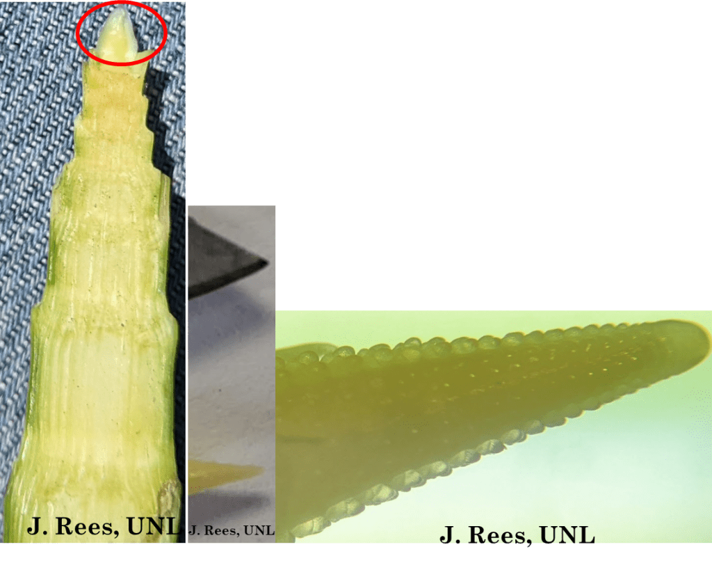 Last week I investigated any potential in non-irrigated corn to better determine when it was done. Photos at jenreesources.com. Corn that is silver/gray and never unrolled with the rain is obviously done. But I was also grateful to see how much corn did unroll when it looked so toasted last Wed.! While very short, some put on several stacked leaves. There’s also a lot of corn rolled again after minimal rain. As I dissected plants in fields throughout the York/Seward county area that were at least 10 leaf (whether these plants were around knee high or above waist high), I found the primary ears and saved them. Carefully dissecting them, I then put them under the microscope. In all fields I was finding 10-16 rows around! So, I was wrong! A few weeks ago I shared I didn’t think we’d have more than 4-8 rows around on these very stressed plants during that 5-8 leaf development time-frame. I’ve wrestled this week in sharing this as I didn’t know if it would provide encouragement or discouragement. We’ve got a long way to go with receiving adequate moisture to get to pollination, timing of pollen-shed/silking coinciding, etc. Yet, I also felt sharing could provide some hope and much-needed encouragement of some potential for those who got some rain and saw leaves unroll. Hopefully this info. does a little of the latter for you. For me, no matter what happens, with my faith, it gave me such an awe of the Creator in seeing these tiny kernels.