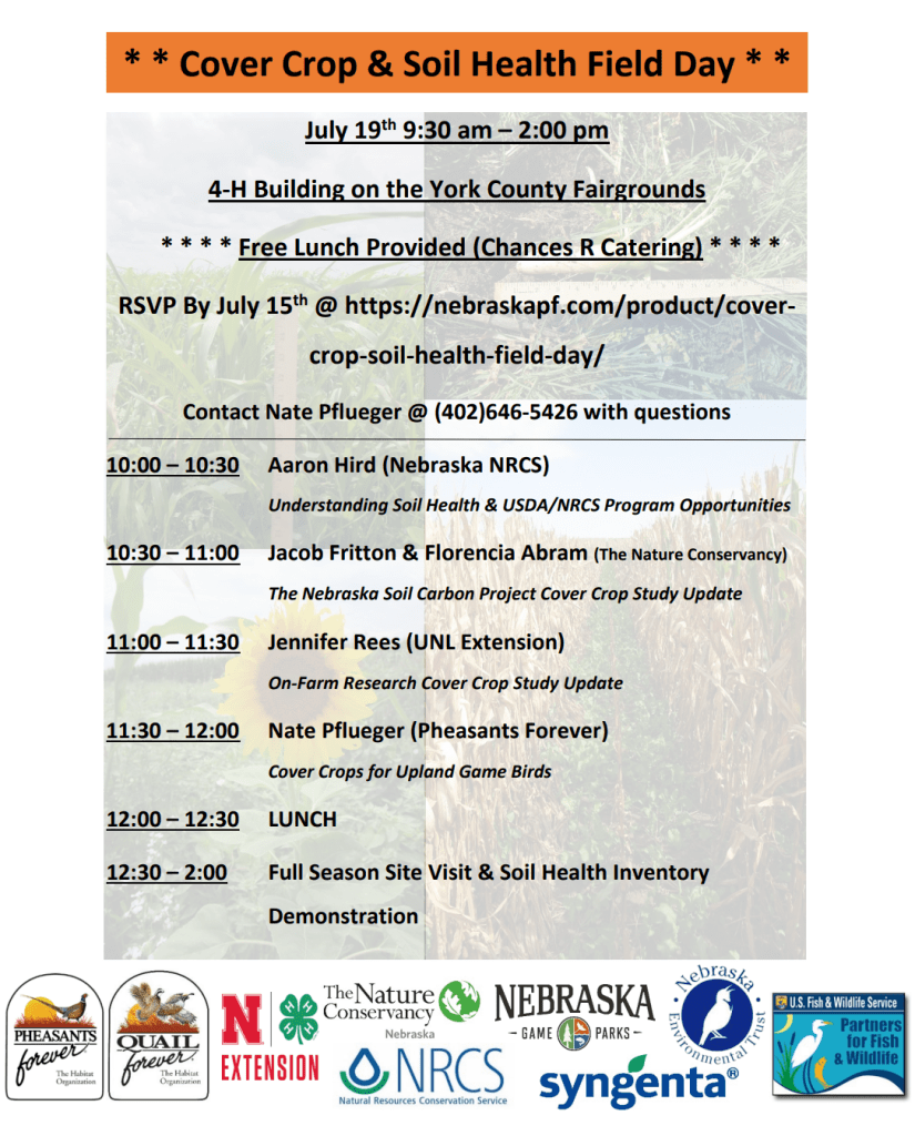 Cover Crop and Soil Health Field Day: This snuck up on me and I failed to talk about it sooner; it will be held this Tuesday July 19th from 10 a.m.-2 p.m. (Registration at 9:30 a.m.) at the 4-H Building at York Co. Fairgrounds. Topics include: understanding soil health, the Nebraska soil carbon product cover crop study; On-Farm research cover crop study update; and Cover crops for upland game birds. Following lunch there will be a cover crop field site visit with a demonstration of how to conduct a soil health inventory. There is no charge but please RSVP for meal count to Nate Pflueger at 402-646-5426.