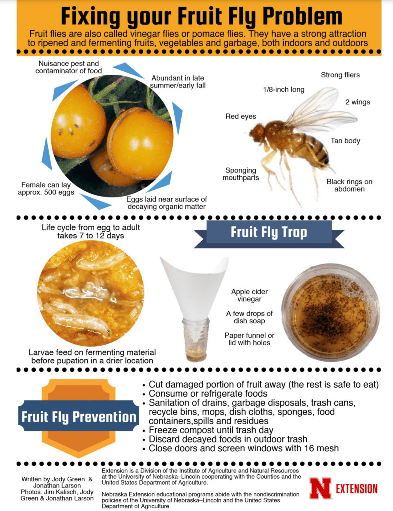 Once the breeding site is eliminated, homemade traps can then be used to trap and remove any additional fruit flies from the home. I was recommending vinegar water in a bowl or cup and discarding each day so no larvae were able to hatch and crawl out. In following up, most said that did the trick. Extension entomologists shared two other trap options using home-made items that you can keep for up to one week on the kitchen counter.
