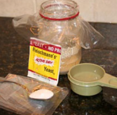 2-“Use a one-pint glass jar. Add 1/4 – 1/3 cup of warm (not boiling) water. Sprinkle a package of activated dry yeast over the water. Add one teaspoon of sugar to activate the yeast. Swirl the yeast liquid. In a few minutes, the sugar will cause the yeast to foam and expand and start producing CO2. Take a small plastic bag (like a sandwich Baggie®) and place over the mouth of the jar with one corner reaching into the jar. . Poke a small hole (no more than 1/8-inch diameter) in the corner of the bag with a pencil. Secure the bag around the rim with a rubber band or canning ring. Fruit flies will immediately be attracted”-Barb Ogg. Be sure to discard the trap in seven days.