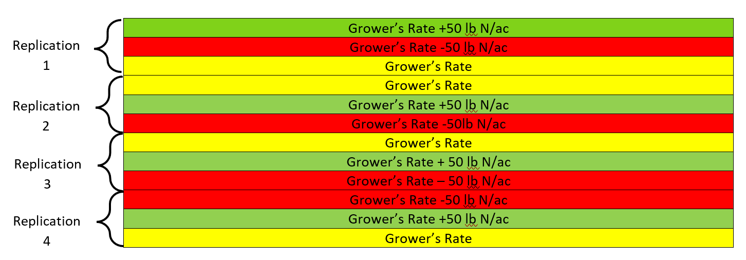 The treatments were: 1) Grower rate 2) Risk averse post-establishment (RAP) (fertigation events applied up to R4 but 30 lb N/ac applied when needed between V9-V14) and 3) Risk averse post-establishment Increased Rate (RAP-IR) (fertigation events applied up to R4 but 60 lb N/ac applied when needed between V9-V14).