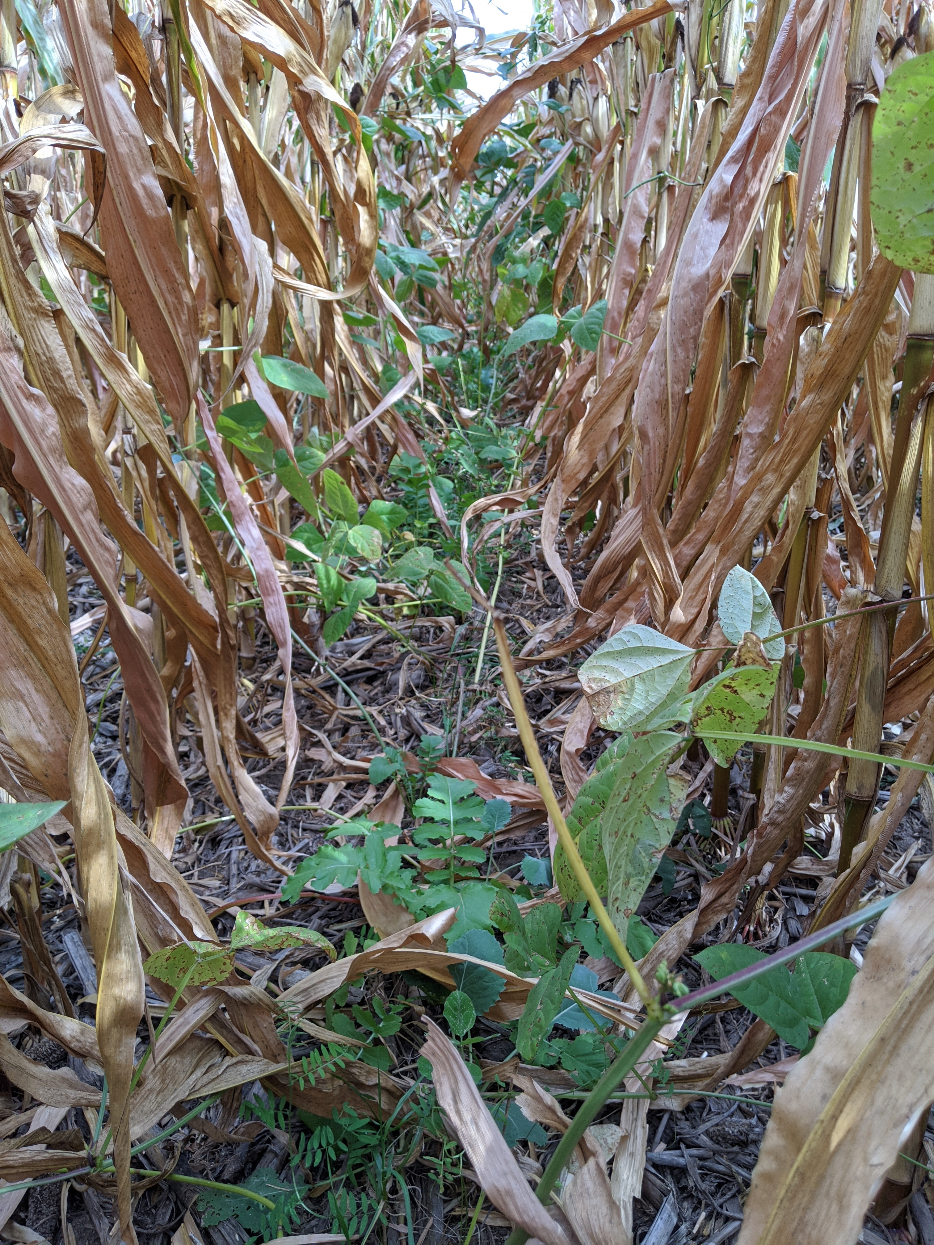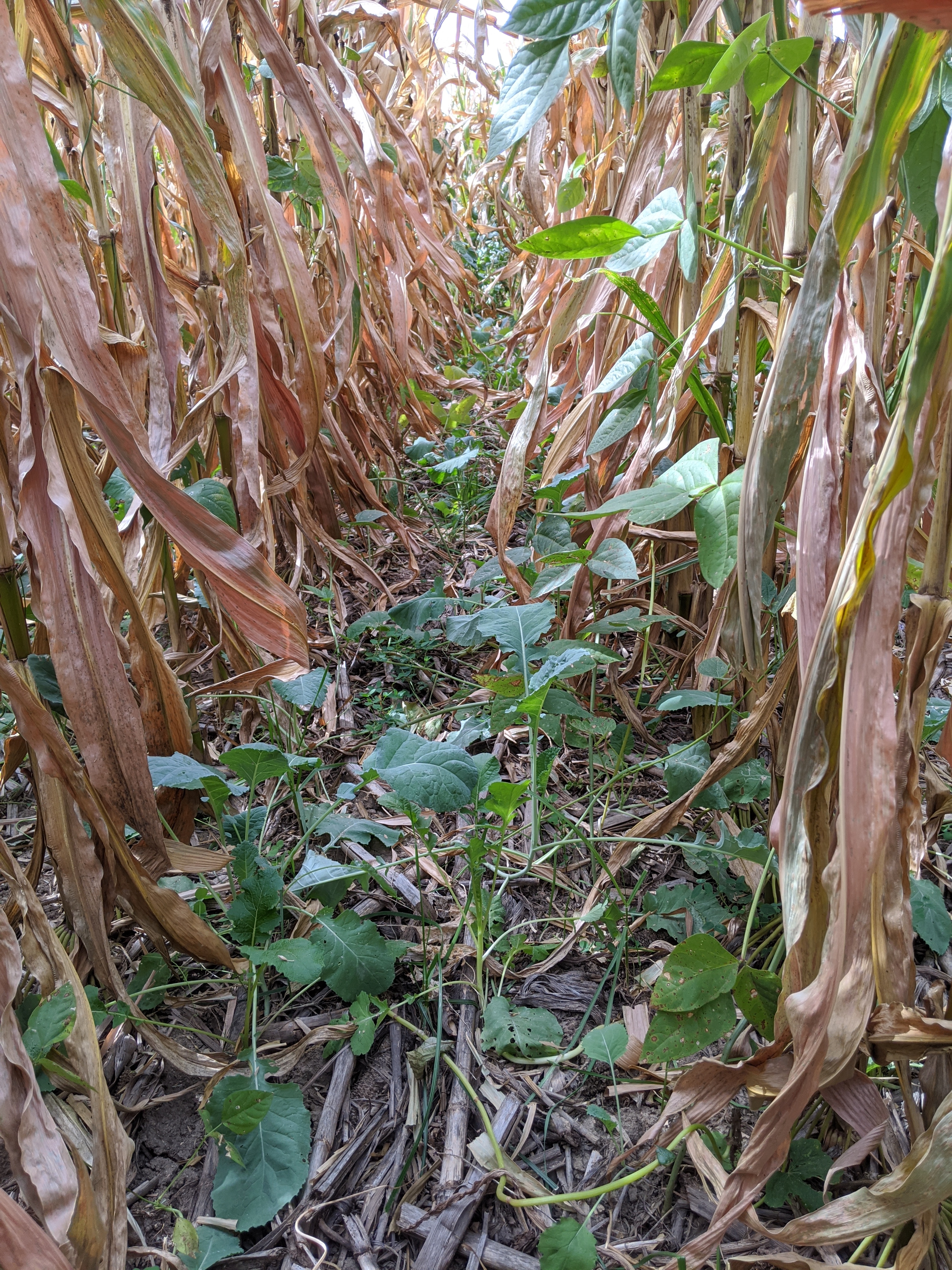 2020 Results: In 2020, cover crops emerged at all locations and grew throughout the season. Cover crop biomass varied by location with the most occurring in fields that were damaged by the July 9, 2020 windstorm (the location with the greatest biomass had 45% green snap). Thus, the open canopy resulted in greater weed and cover crop biomass. Biomass samples were collected in late September by taking three 30” X 30” or 36 X 36” squares for each treatment (dependent upon row spacing). The samples were sorted in the field into weeds, interseeded forbs/legumes, and interseeded grasses and placed in separate paper bags. Samples were weighed and dried. We wanted to compare any differences in weed biomass between the check and interseeded treatments, especially since no residual herbicides were used in 2020. There were no differences in weed biomass between the check and interseeded cover crop treatments. Total cover crop biomass accumulated varied by site and ranged from 277 lb/ac to 3818 lb/ac. It should be noted that the cover crops continued to grow after we sampled until the first hard freeze occurred. The cowpeas provided the greatest biomass and grew to the tops of the tassels. They also formed a ‘bridge’ between corn rows where the canopy broke open. Cowpeas, hairy vetch, sweetclover, and forage soybean were all fixing nitrogen during the 2020 growing season. The red clover and hairy vetch that survived the winter were fixing nitrogen in the spring of 2021.